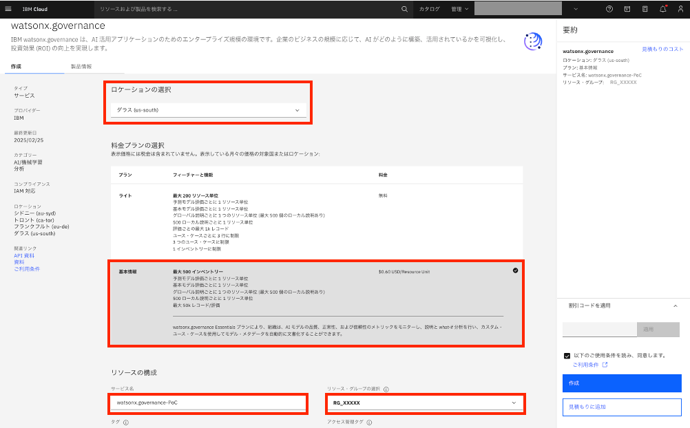 - サービス名 セクションで、サービス名に watsonx.governance-XXXXX を入力(XXXXXは任意の文字列)、リソース・グループの選択で前で作成した RG_XXXXX を選択する。タグは空欄でOK