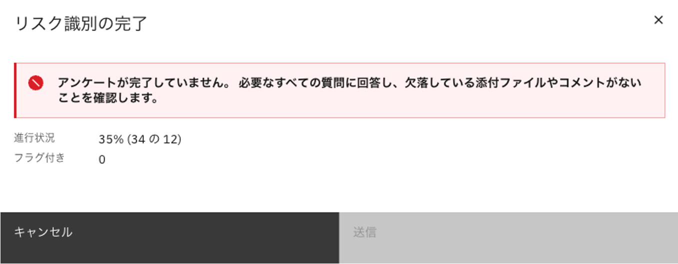 全ての質問に回答していない場合、下記のメッセージが表示されます。画面左側の進捗状況エリアで未回答の質問を確認します。