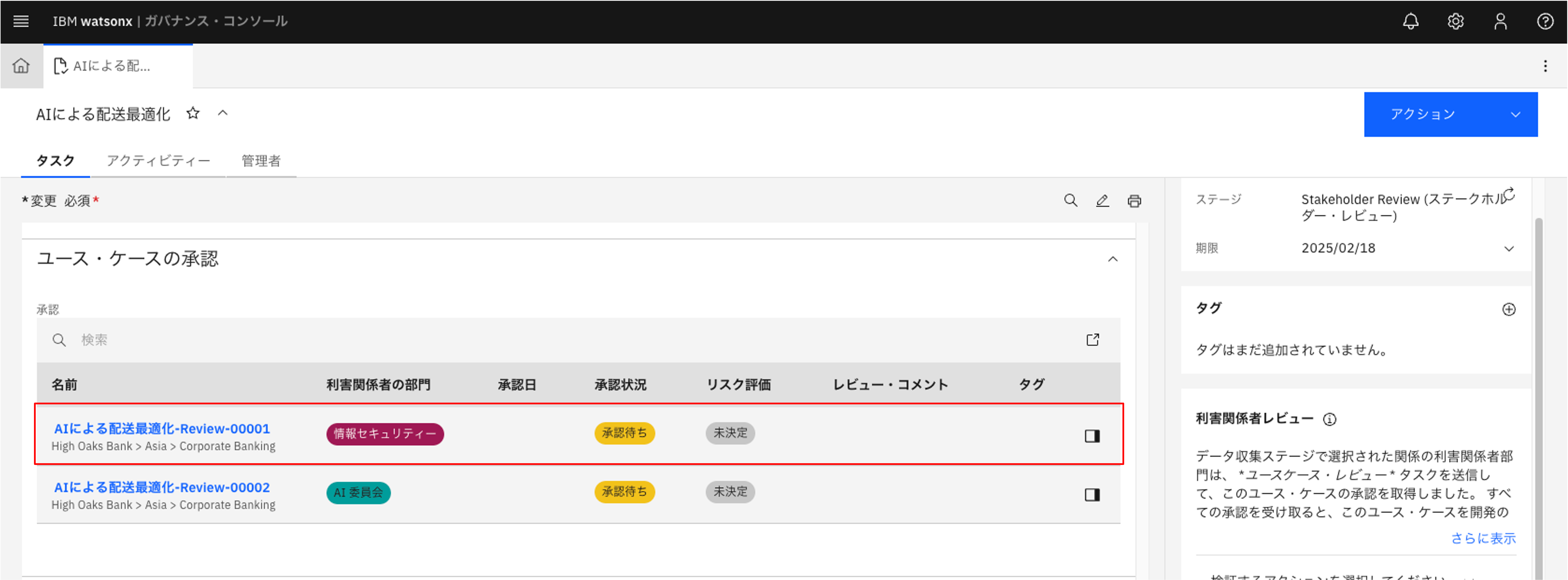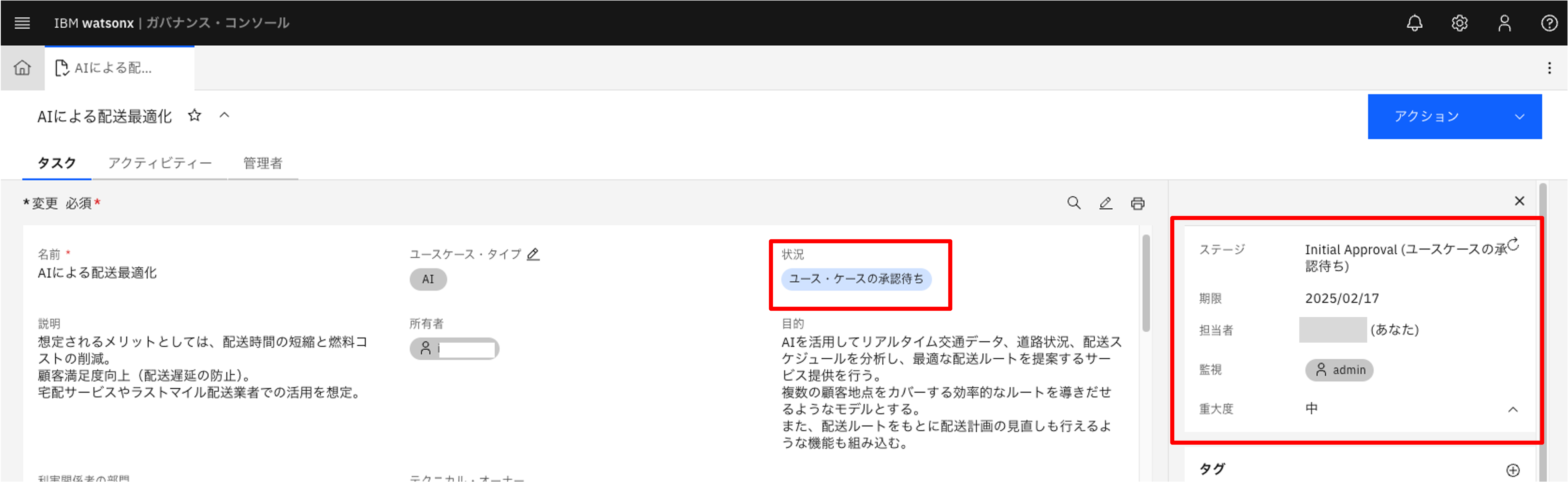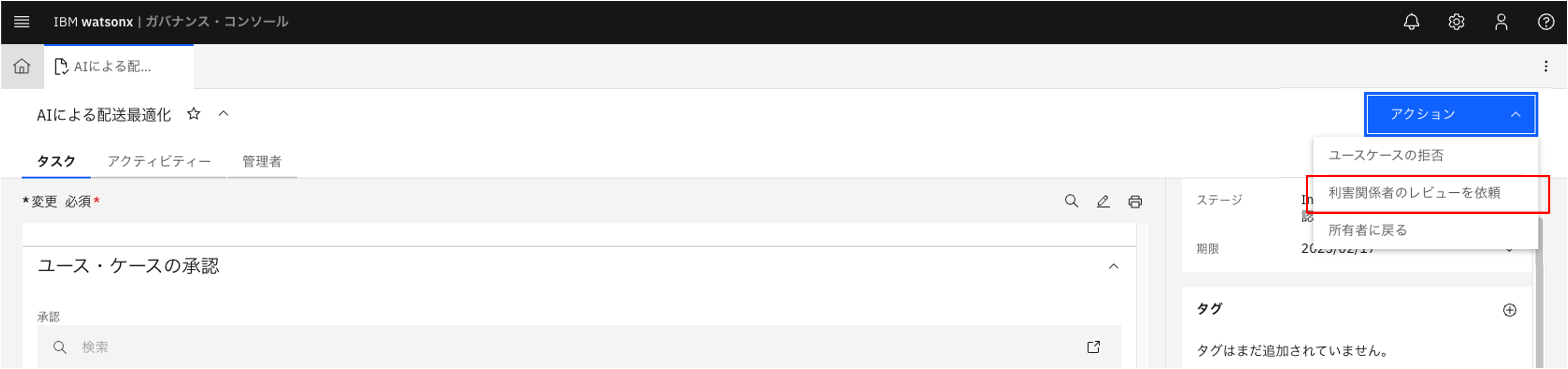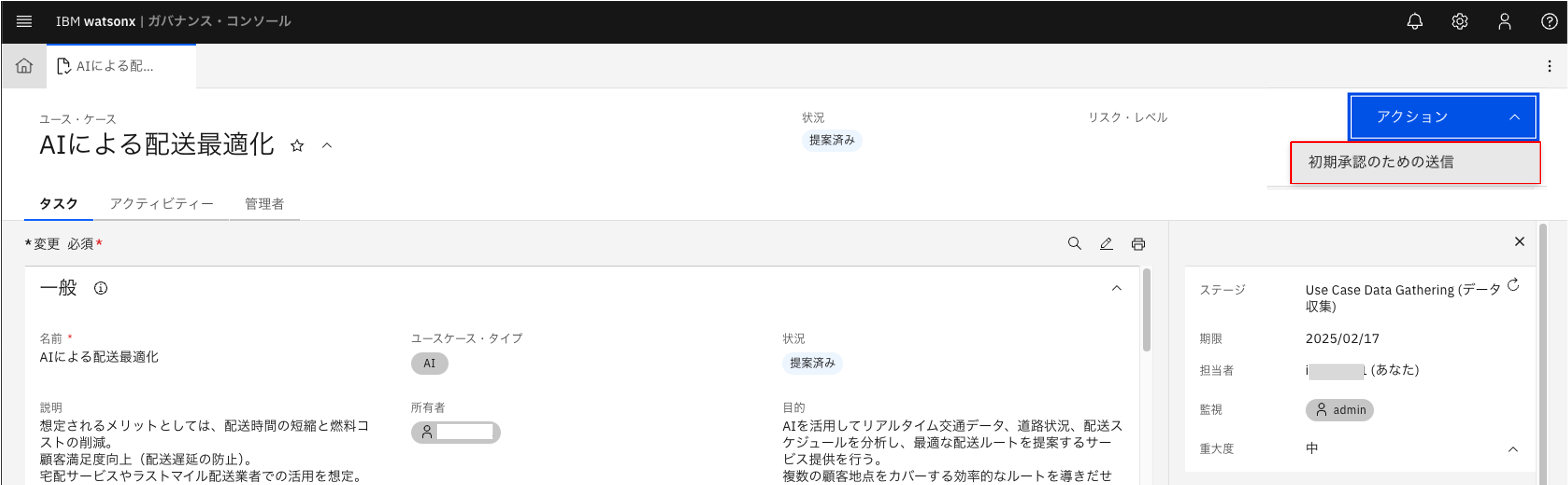 watsonx.governanceでは、ワークフローを次に進める操作を 「アクション」 と呼んでいます。