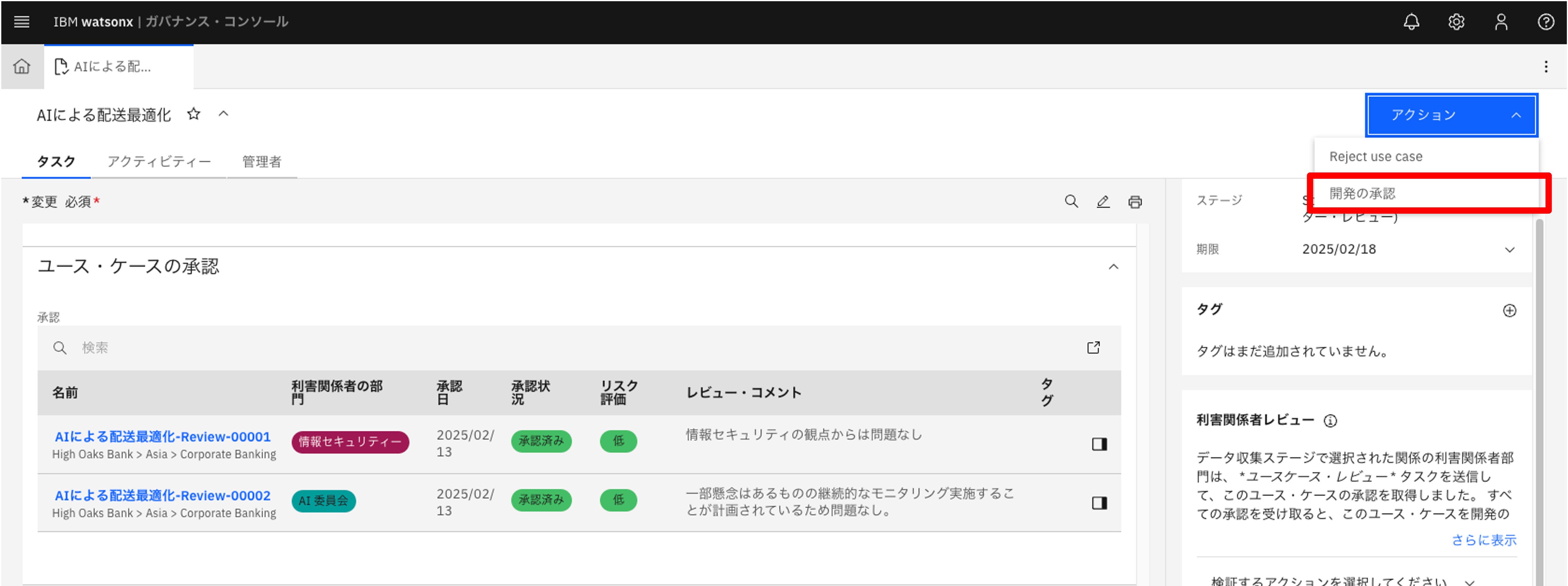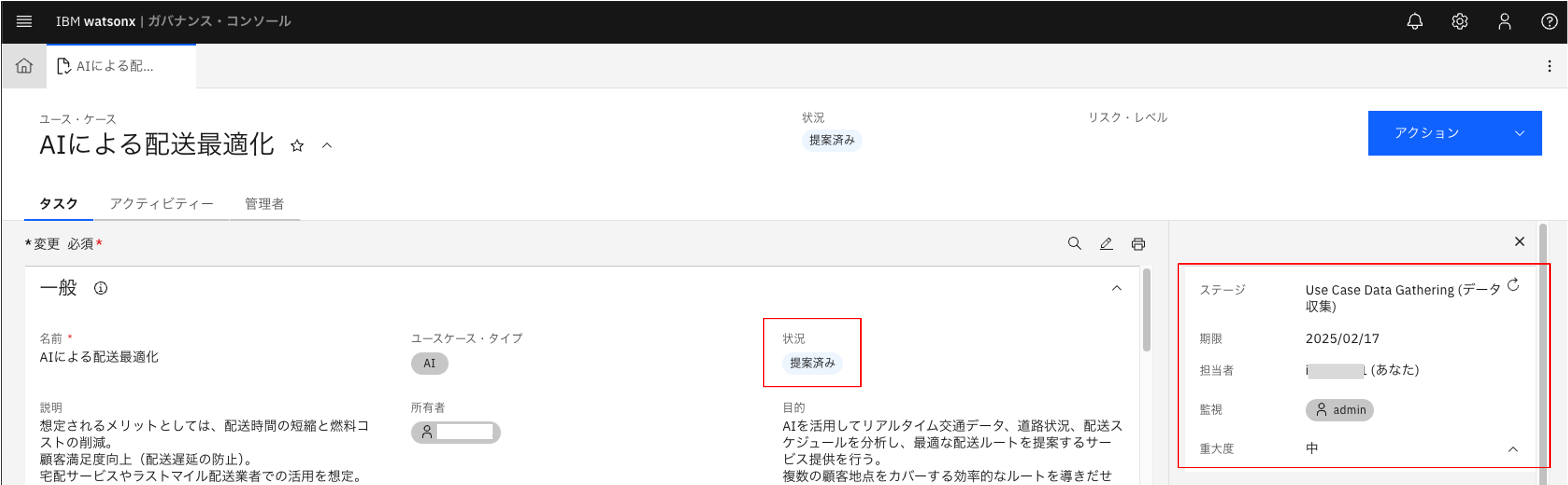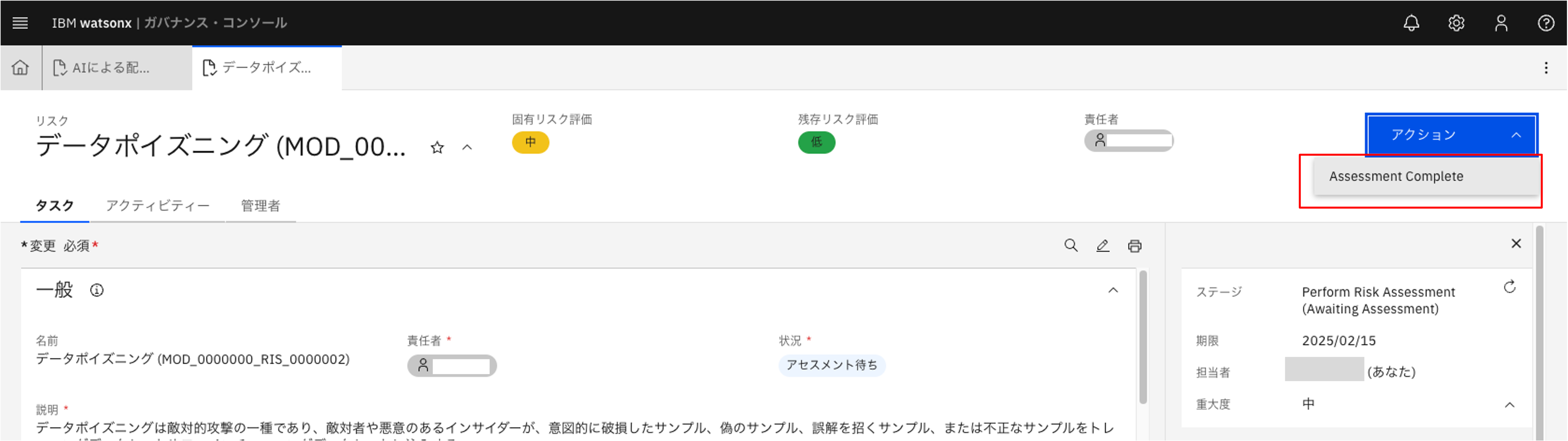 watsonx.governanceでは、ワークフローを次に進める操作を 「アクション」 と呼んでいます。