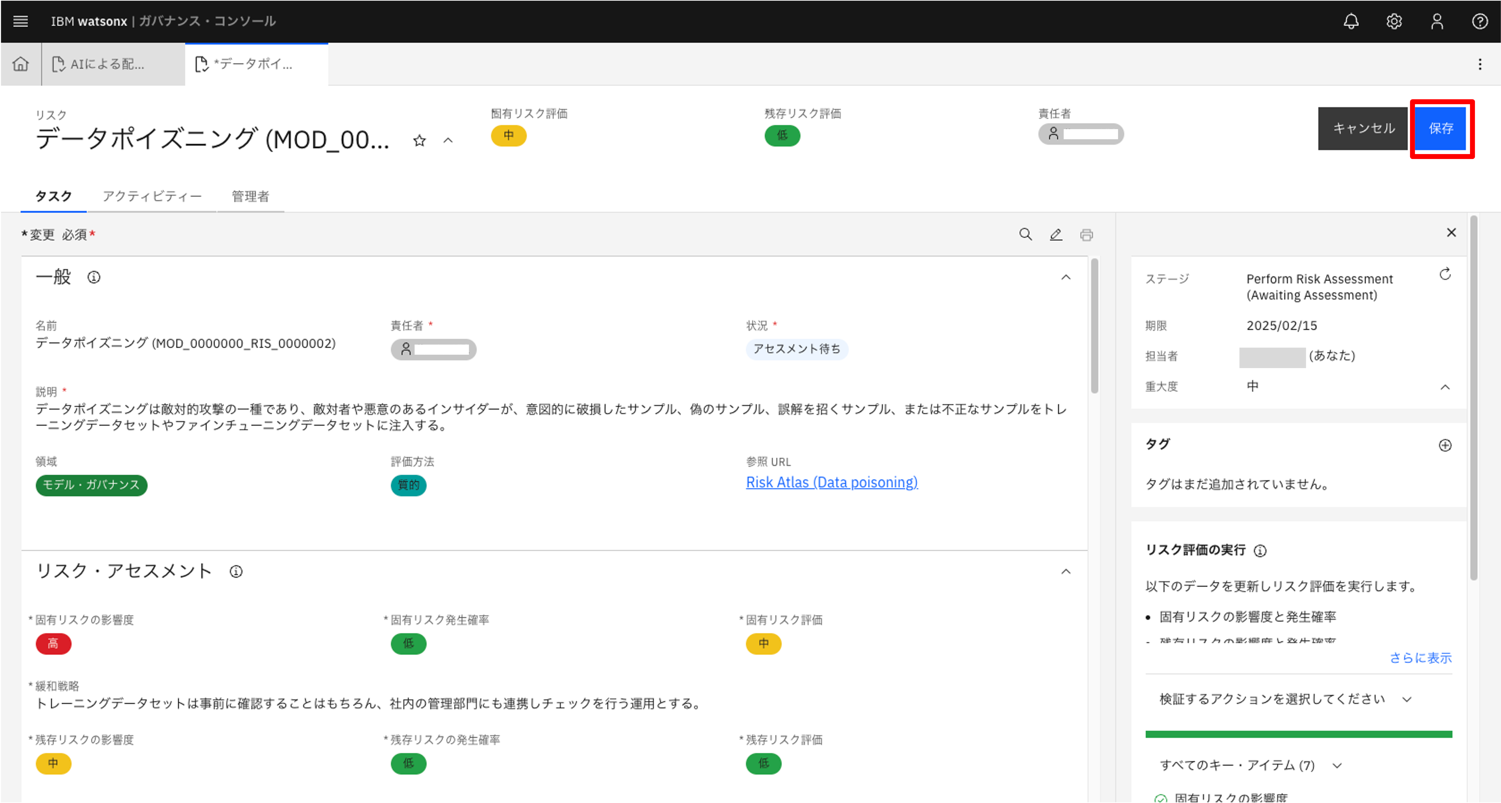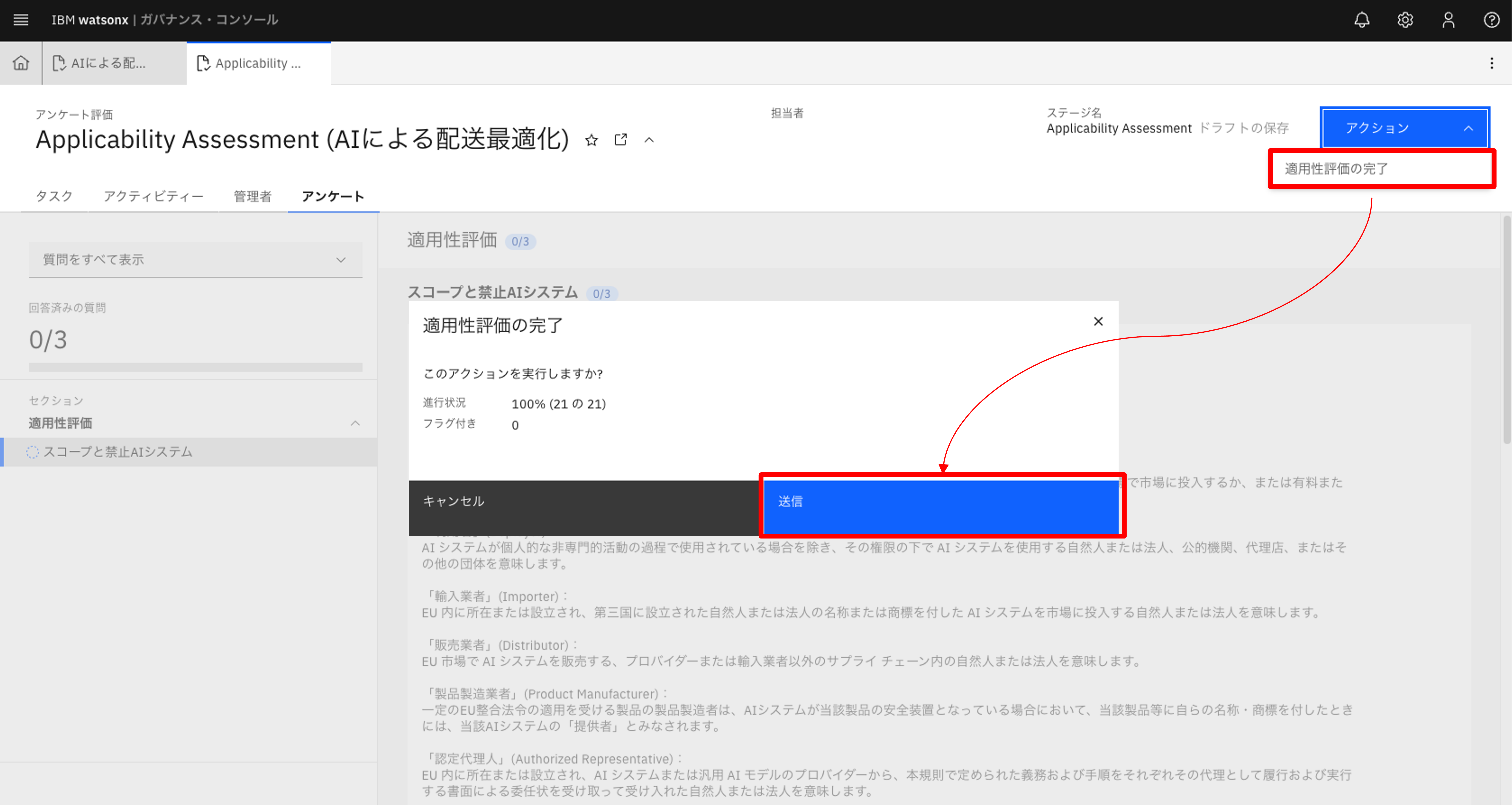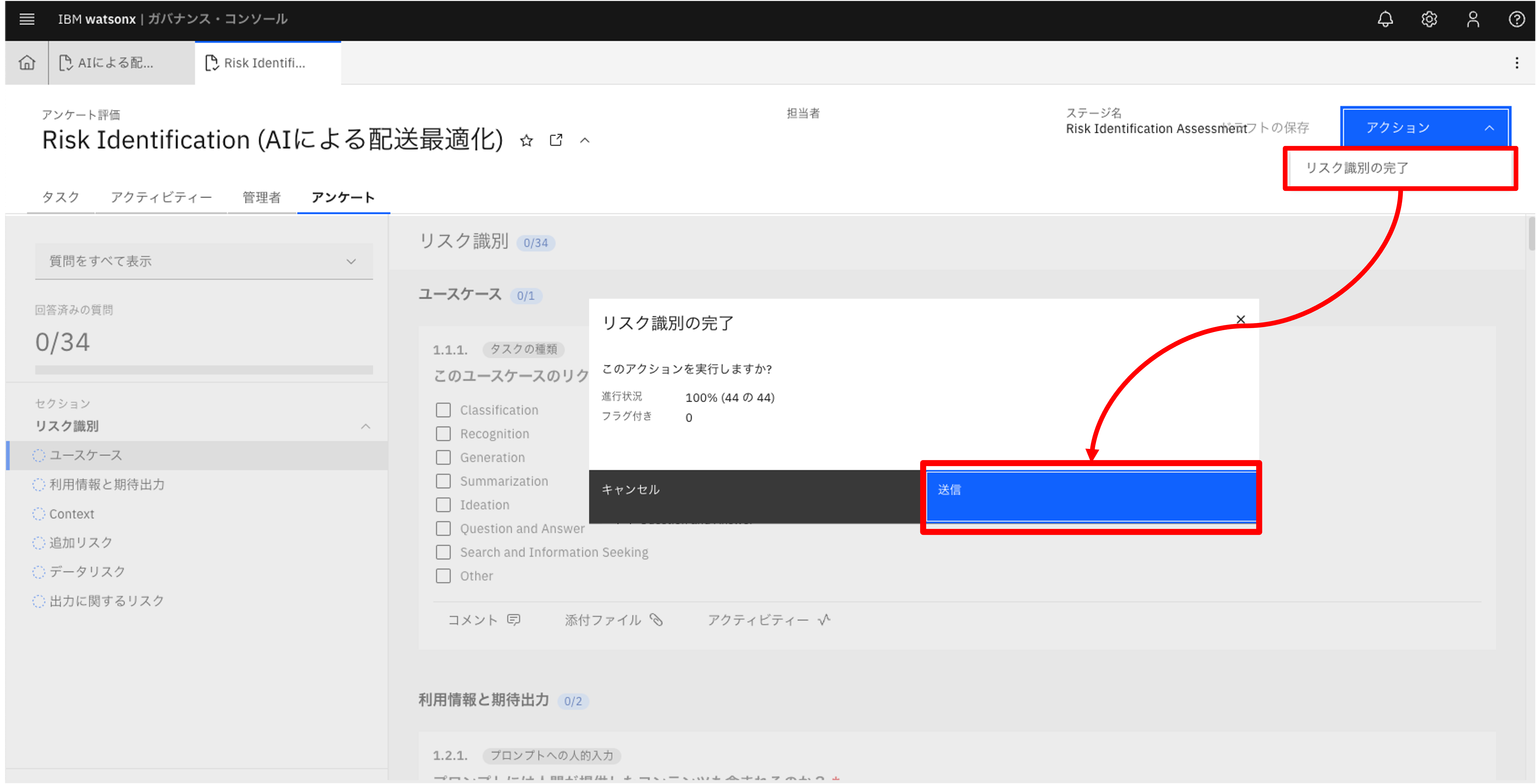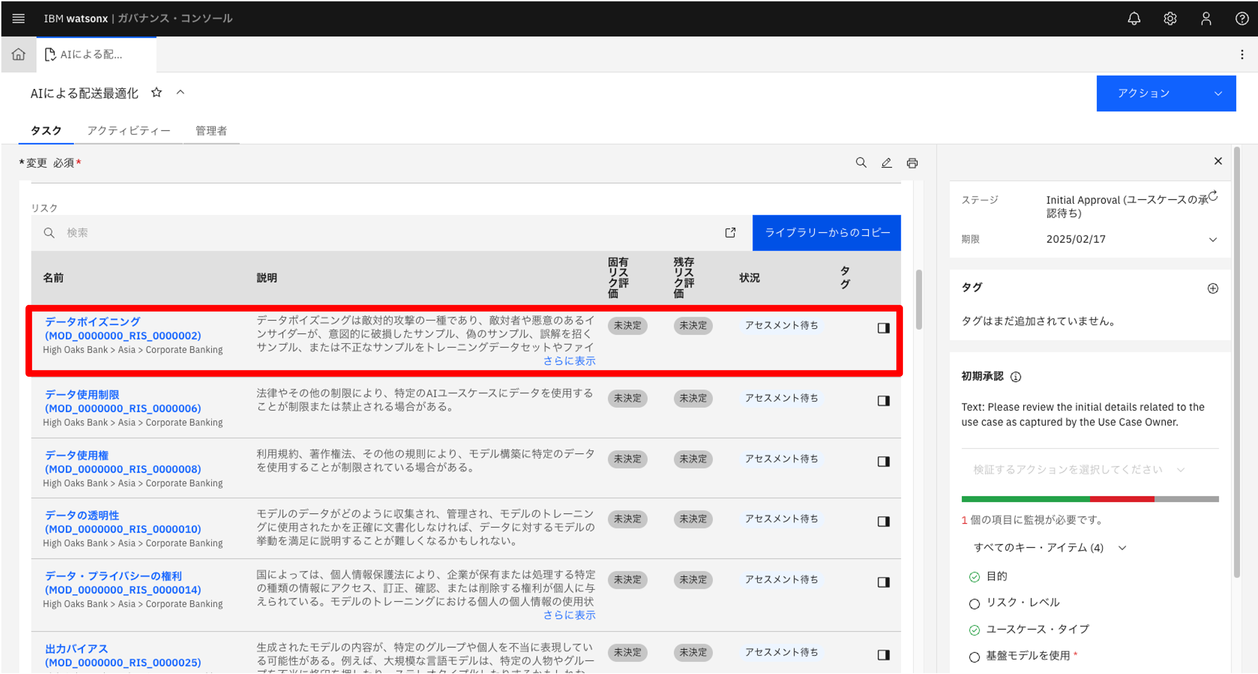 watsonx.governanceでは、ワークフローを次に進める操作を 「アクション」 と呼んでいます。