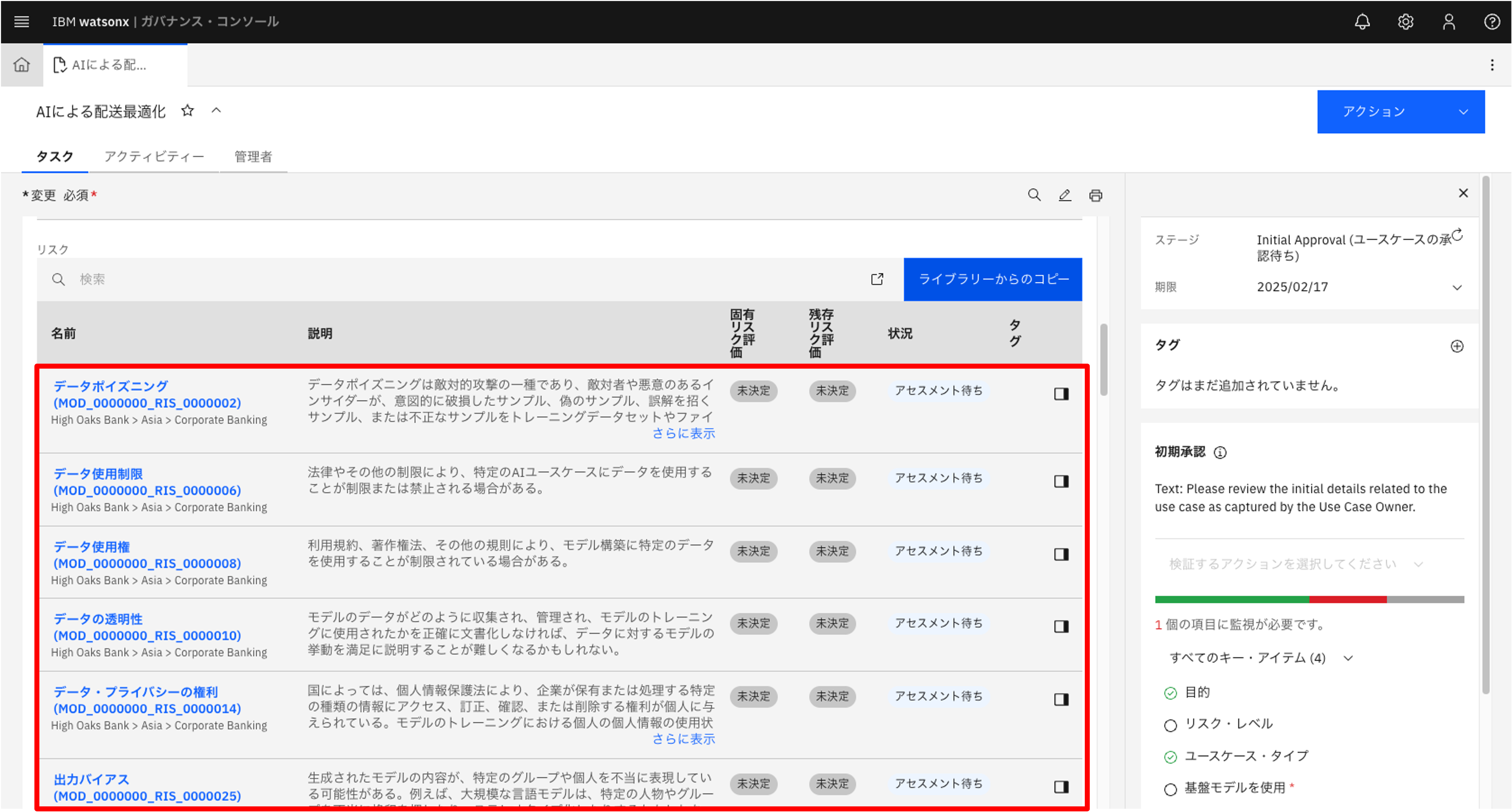 - ユースケース画面に戻ります。Risk Identificationアンケート回答内容に応じて、評価対象となるリスクが自動的に割り当てられていることが確認できます。