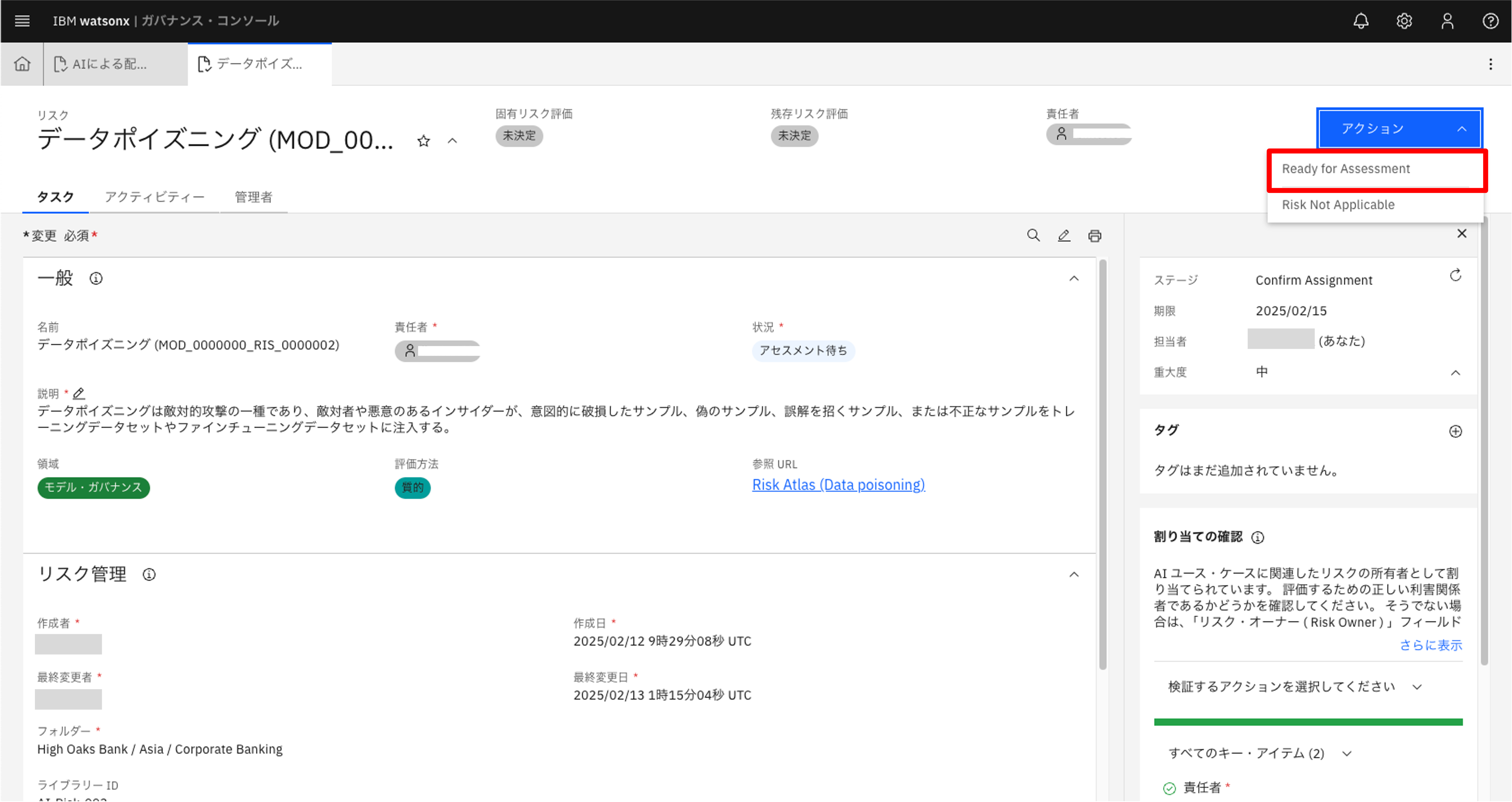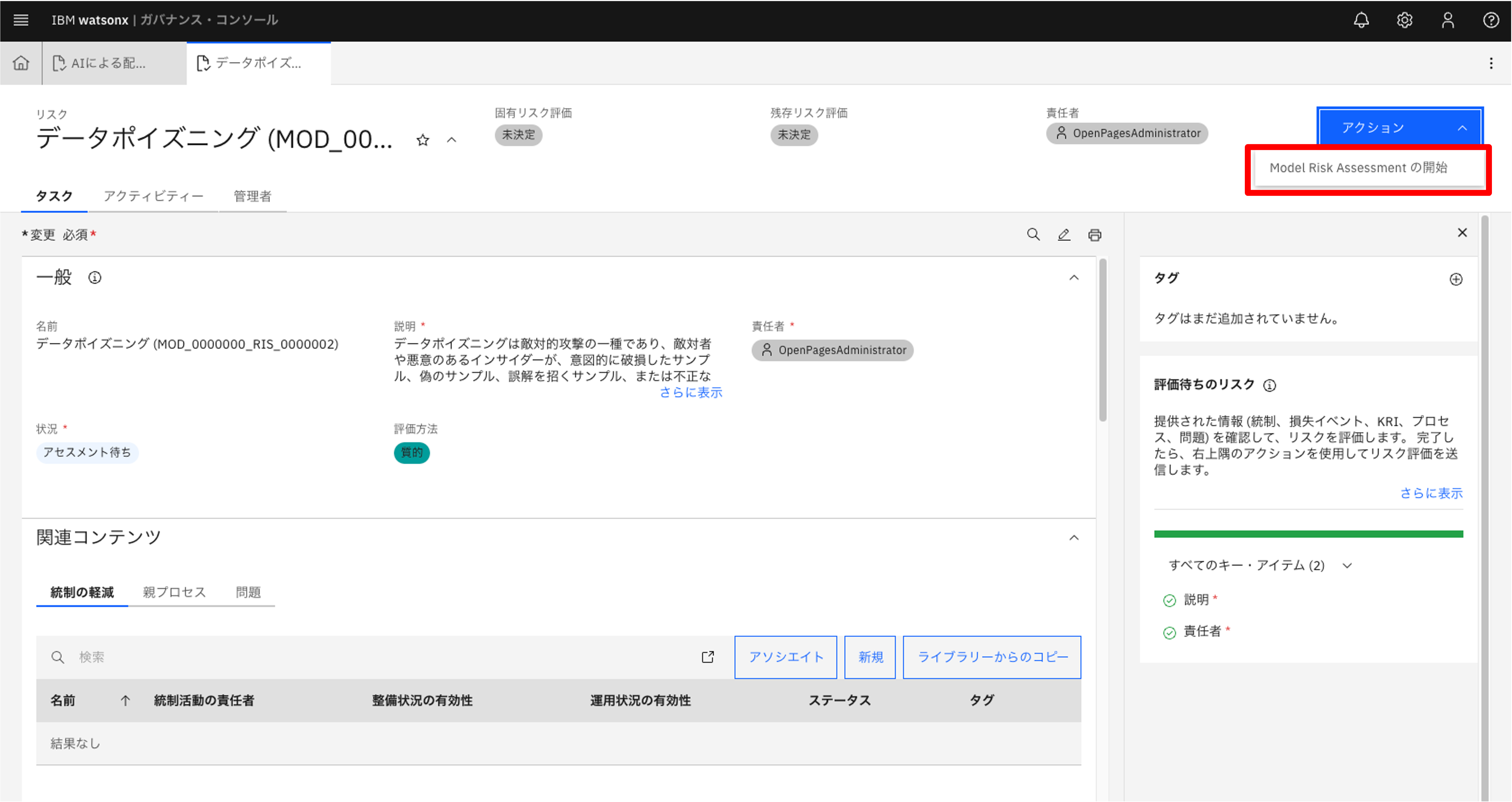 画面右上の アクション より Model Risk Assessment の開始 をクリックします。