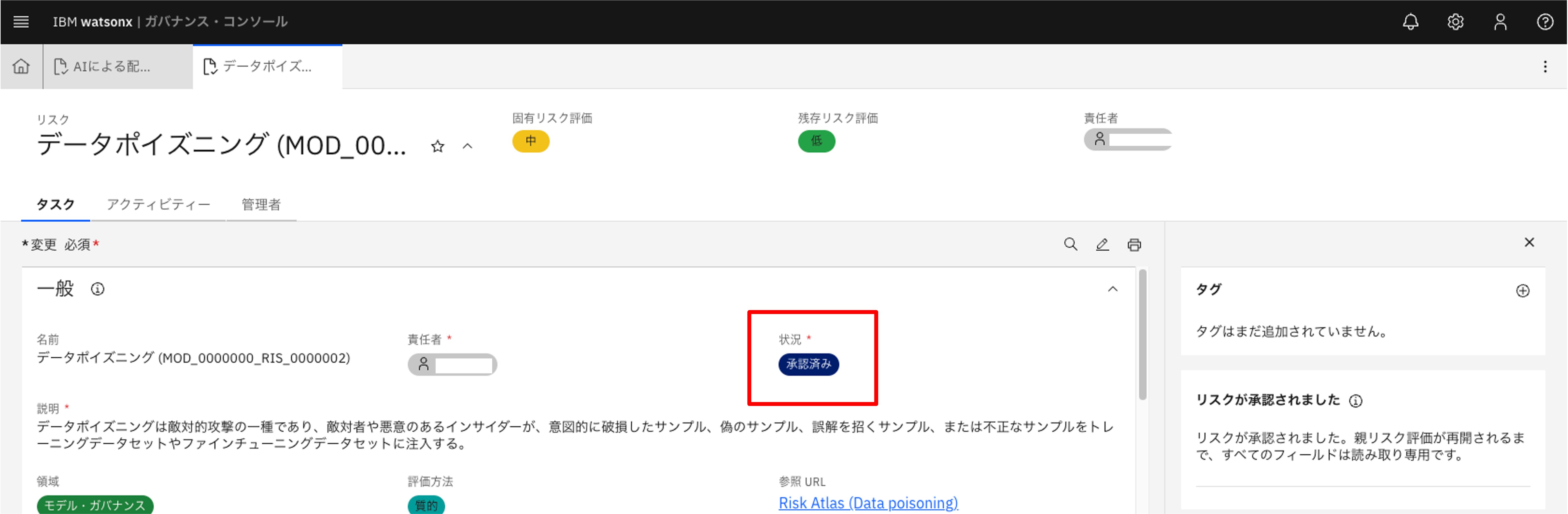 - リスク評価が完了し、状況 が「承認済み」に更新されます。
