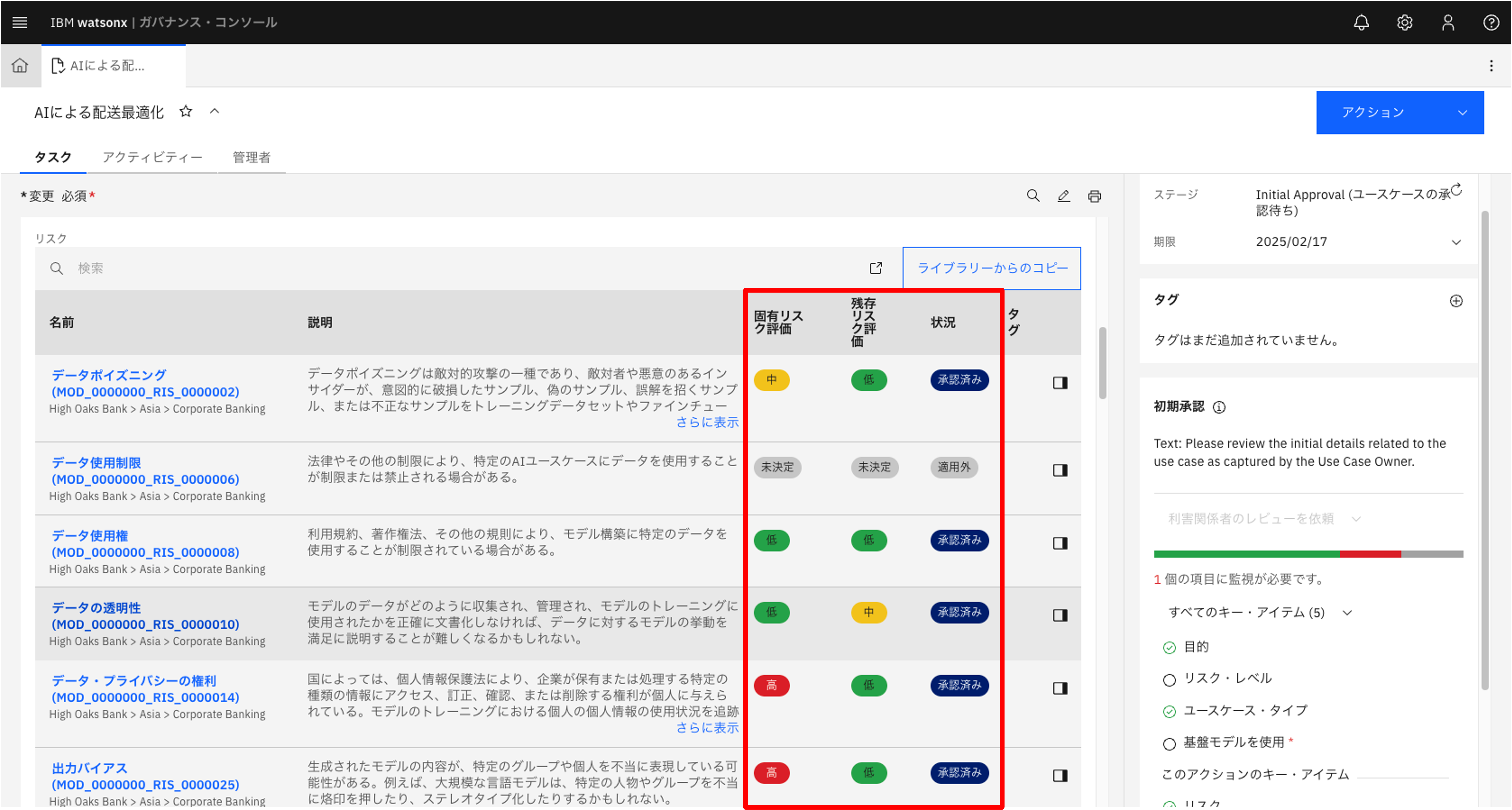 - その他の割り当てられたリスクに関しても評価を完了します。ワークフローを次に進めるために関連付けられているリスクの 状況 が 「承認済み」もしくは「適用外」となっている必要があります。
