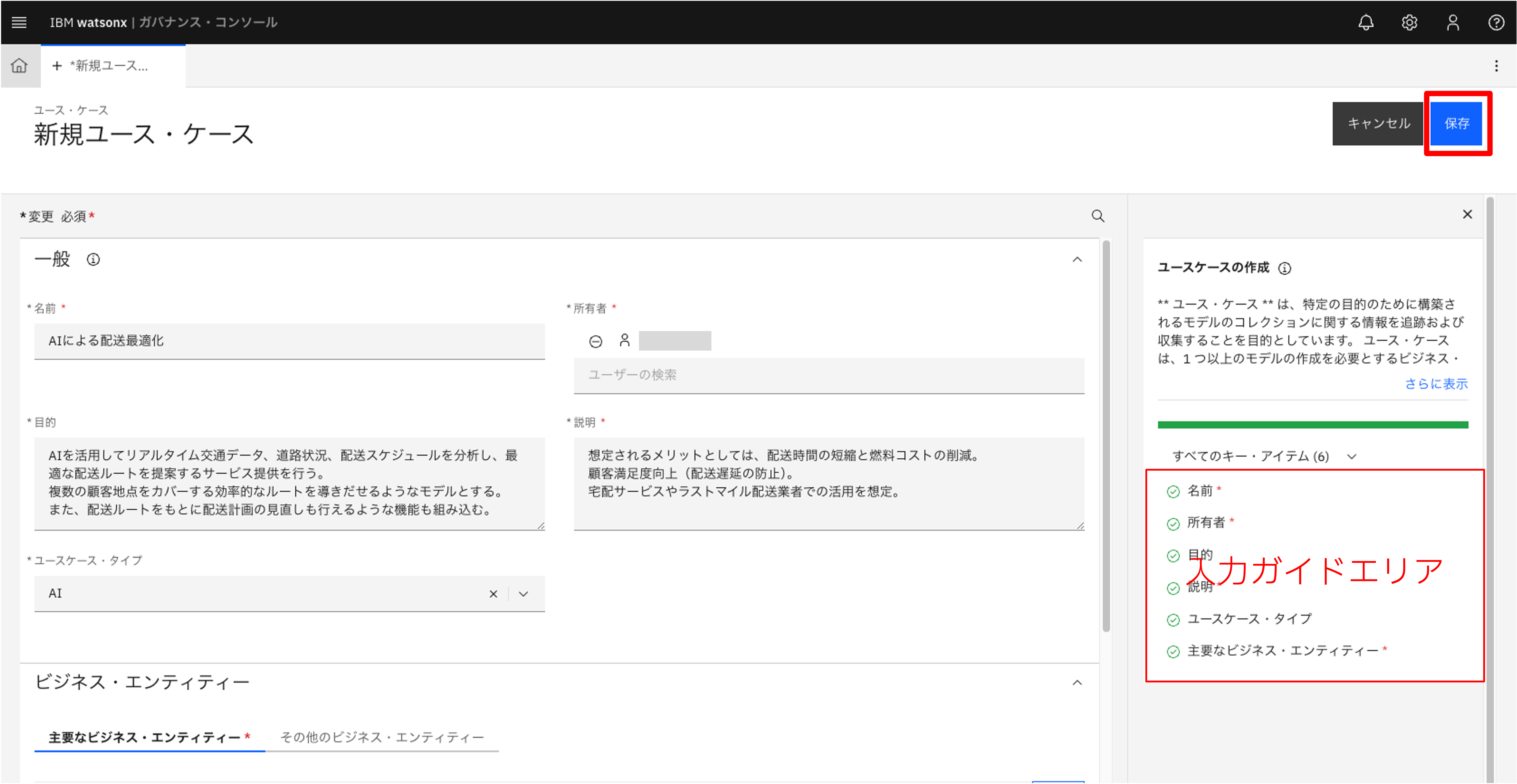 - 新規ユース・ケース作成画面で必要な情報を入力し 保存 ボタンをクリックします。