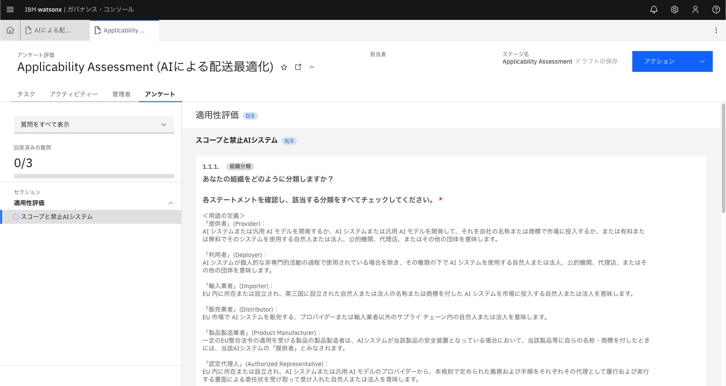 - Applicability Assessment:EU AI Actのリスクレベル判定のためのアンケートです。アンケートに回答することにより、EU AI Actのリスクレベル(禁止、高、制限、最小、範囲外)を自動判定します。