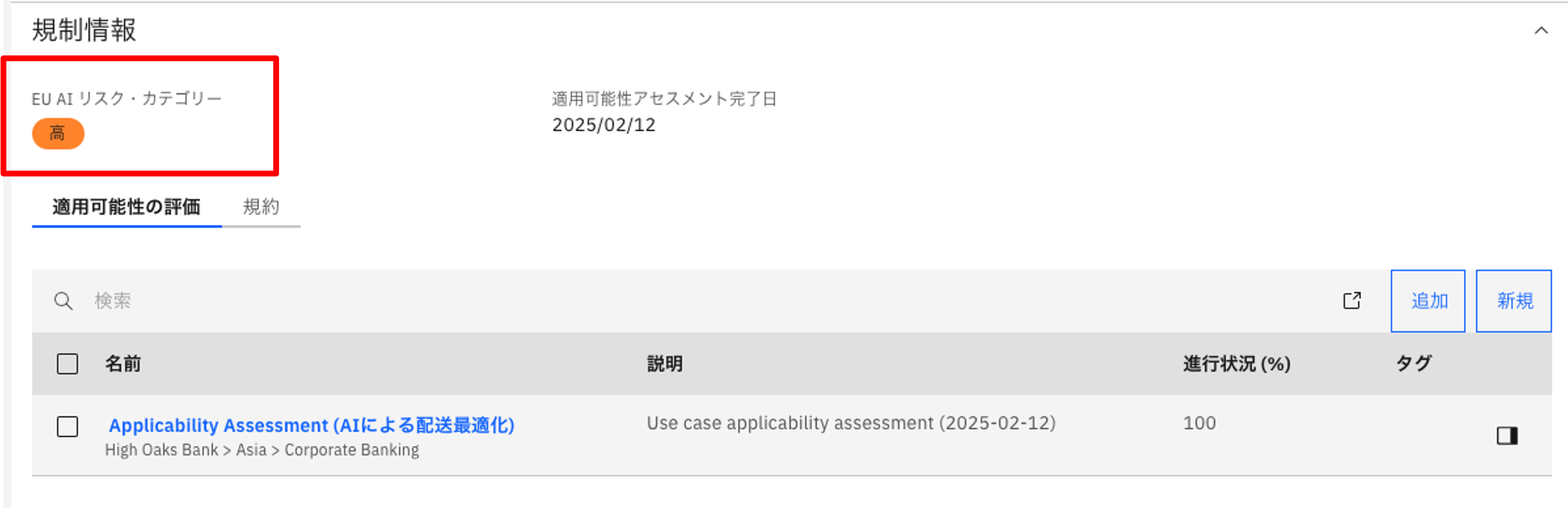 ユースケース画面に戻ると、EU AI リスク・カテゴリー がアンケート回答に従い更新されていることが確認できます。