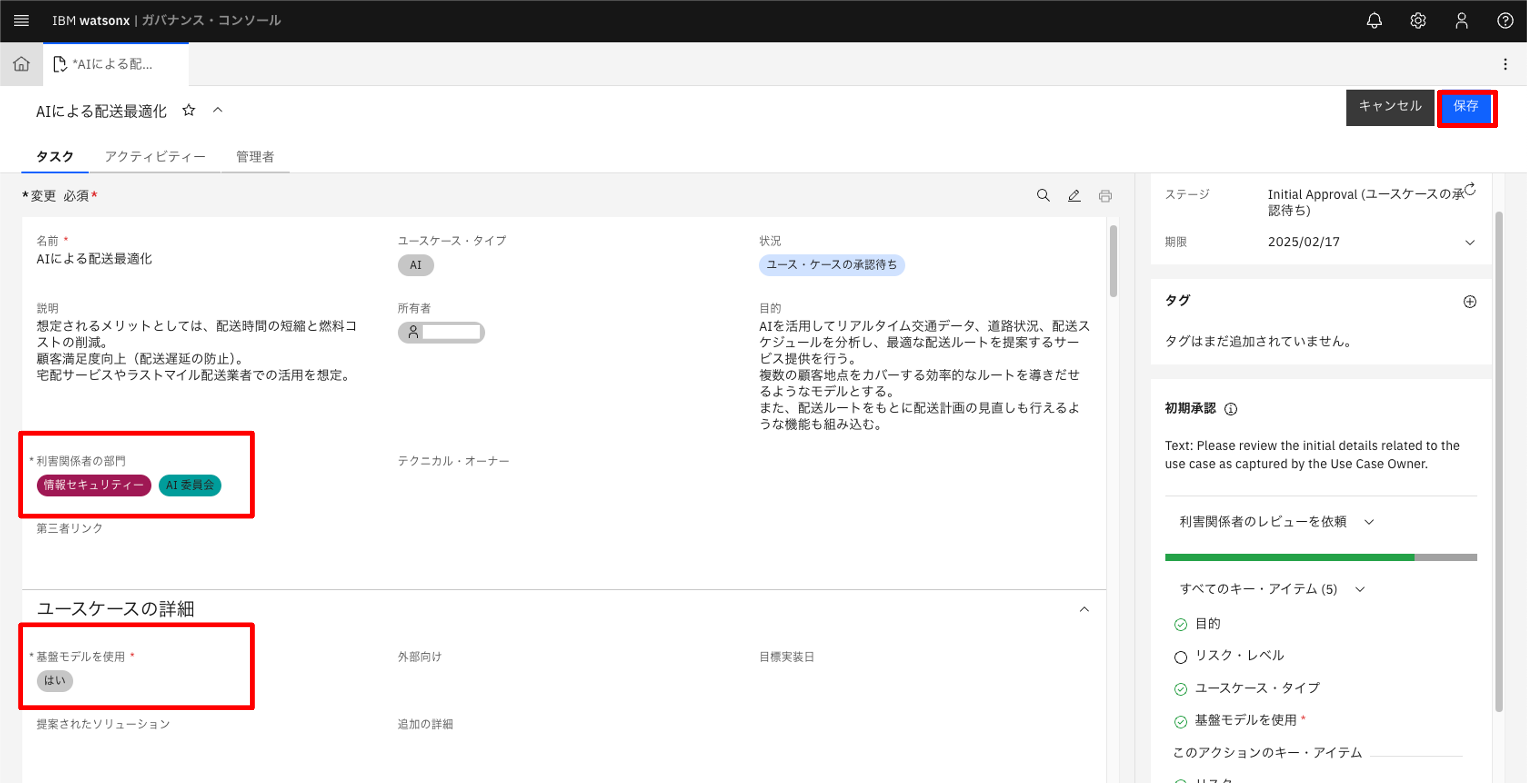 ユースケース画面で 利害関係者の部門、「基盤モデルを使用」を更新し、保存 をクリックします。