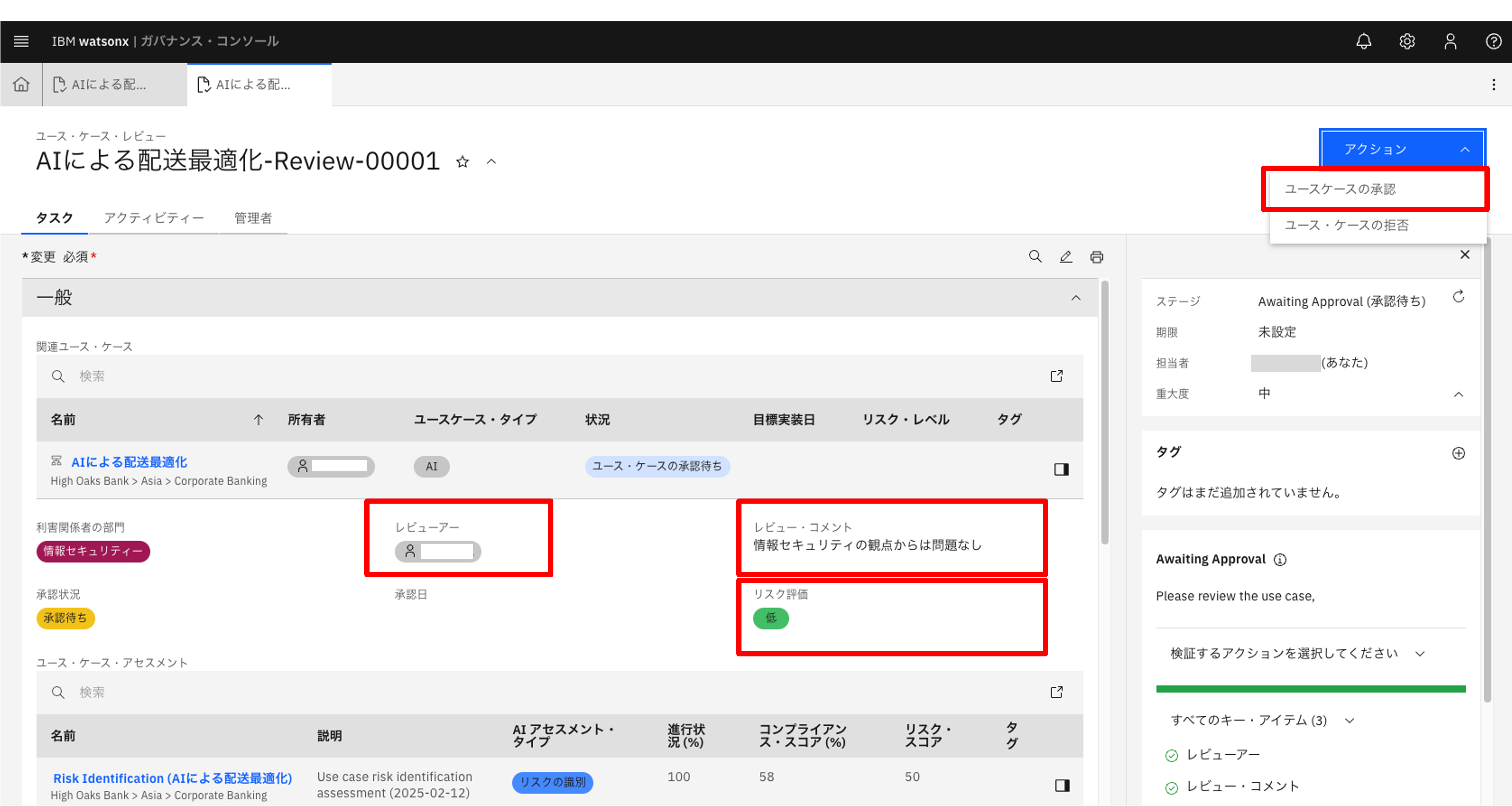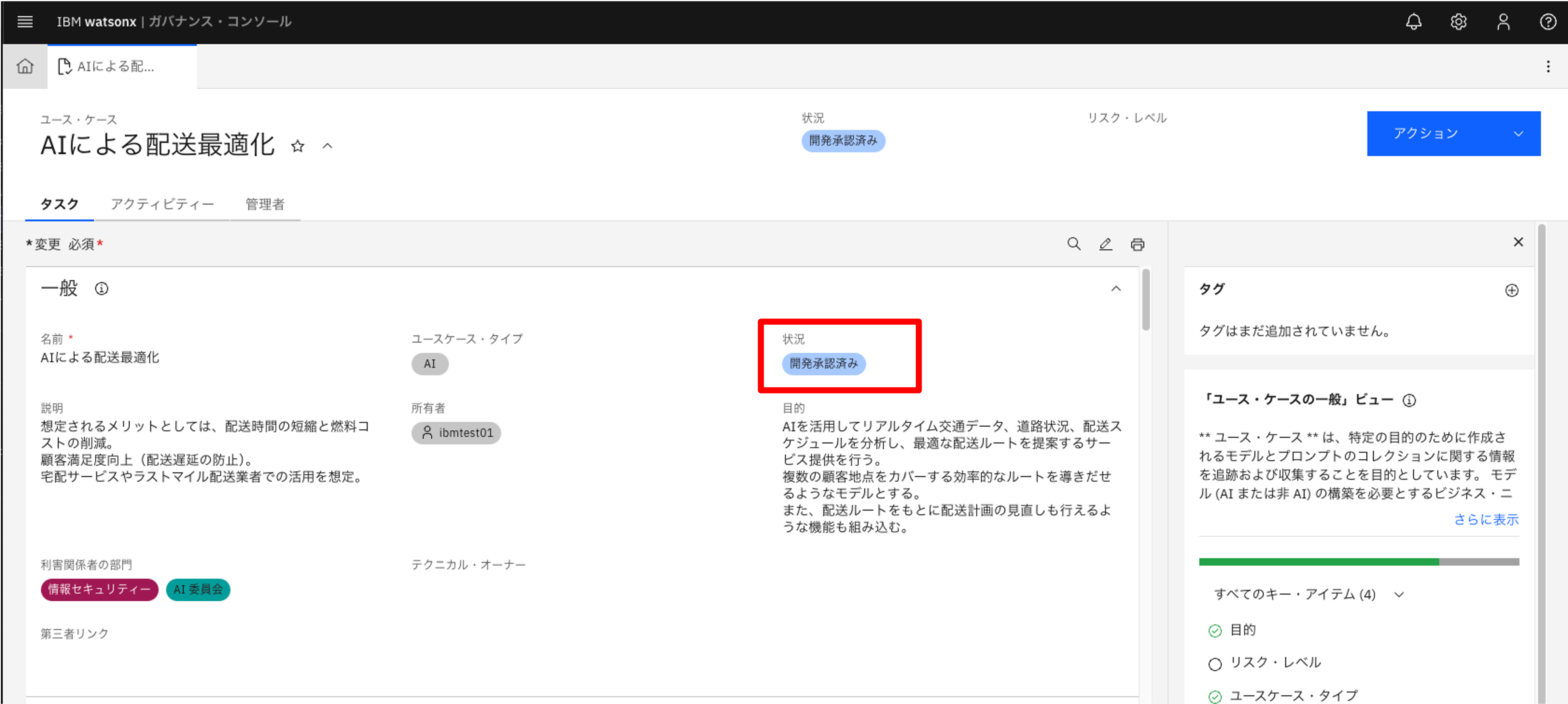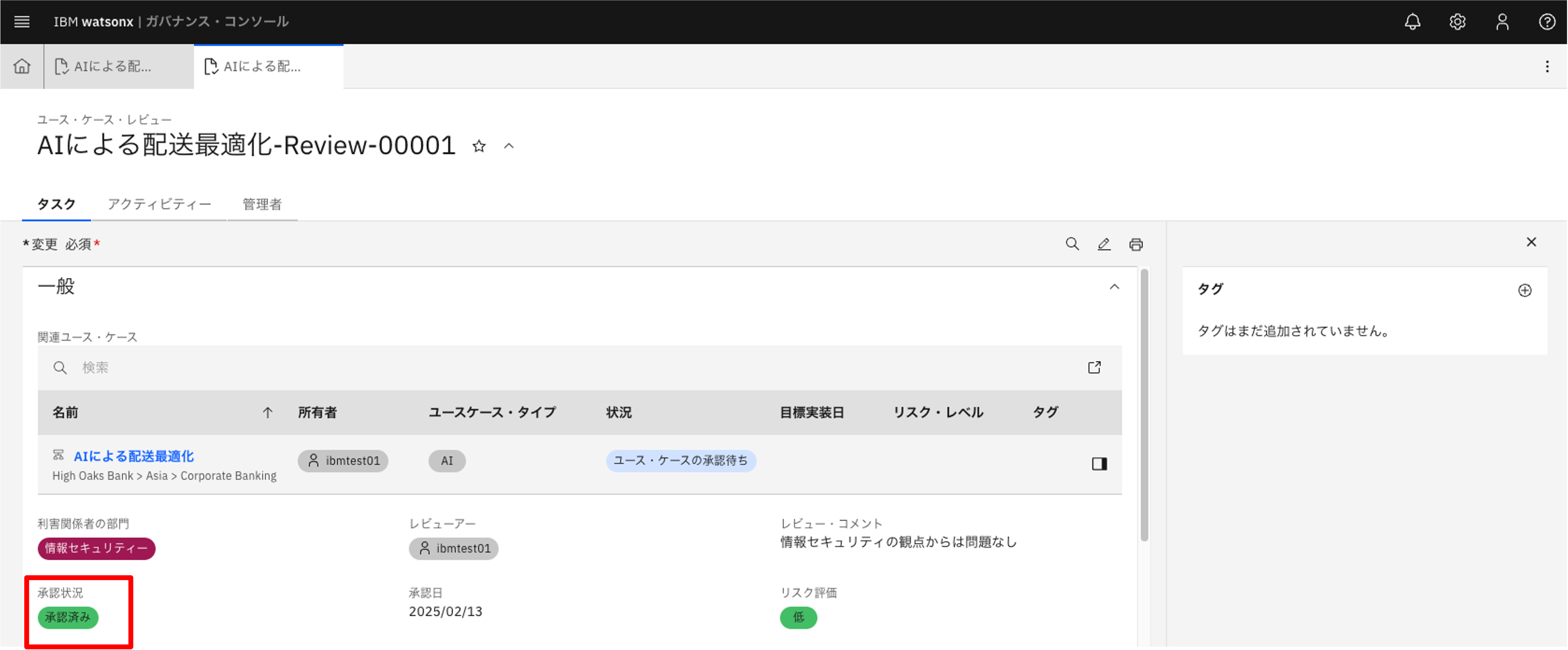- ワークフローステージが「ユースケースの承認待ち」となり、状況も「ユース・ケースの承認待ち」に更新されていることが分かります。
