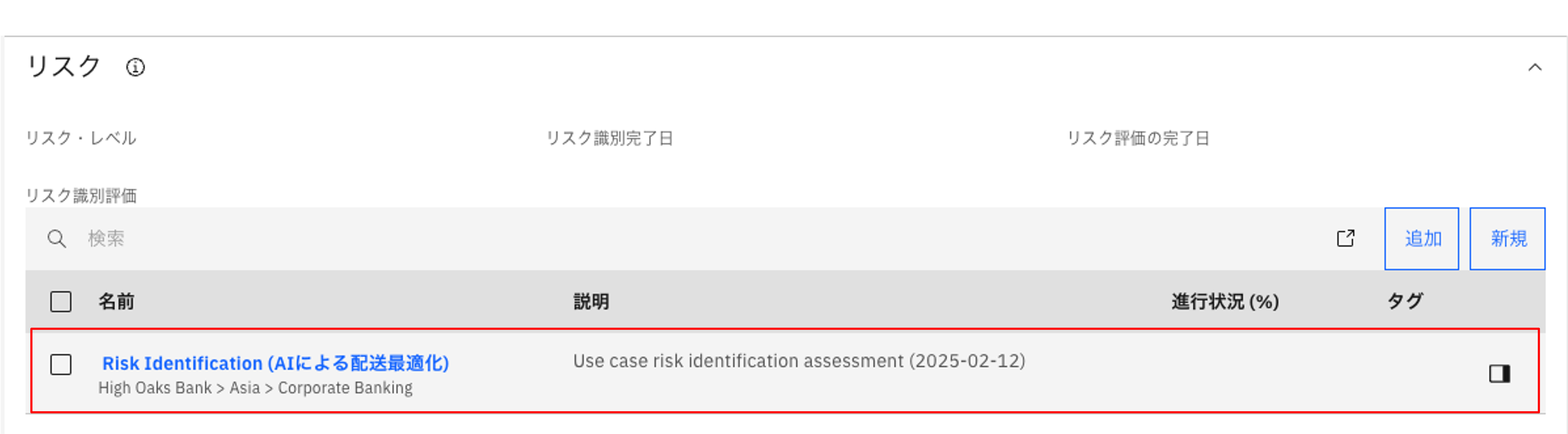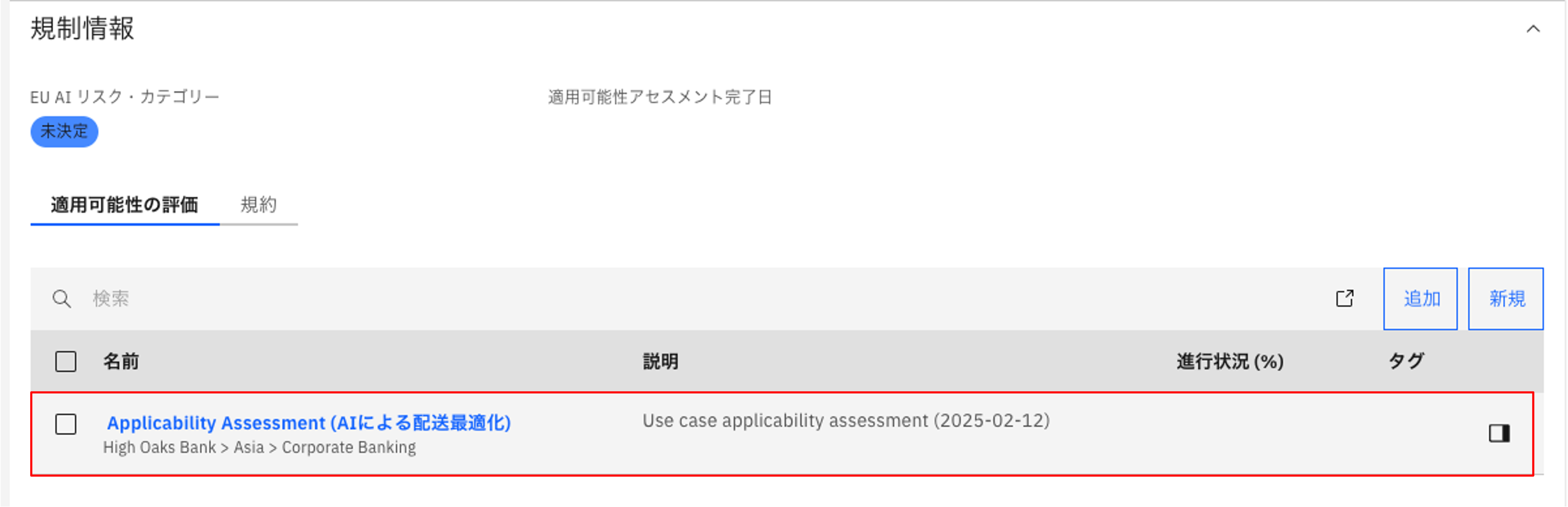 - ユースケース情報を下へスクロールすると、リスク セクションに「Risk Identification(ユースケース名)」、規制情報 セクションに「Applicability Assessment(ユースケース名)」が割り当てられていることが確認できます。