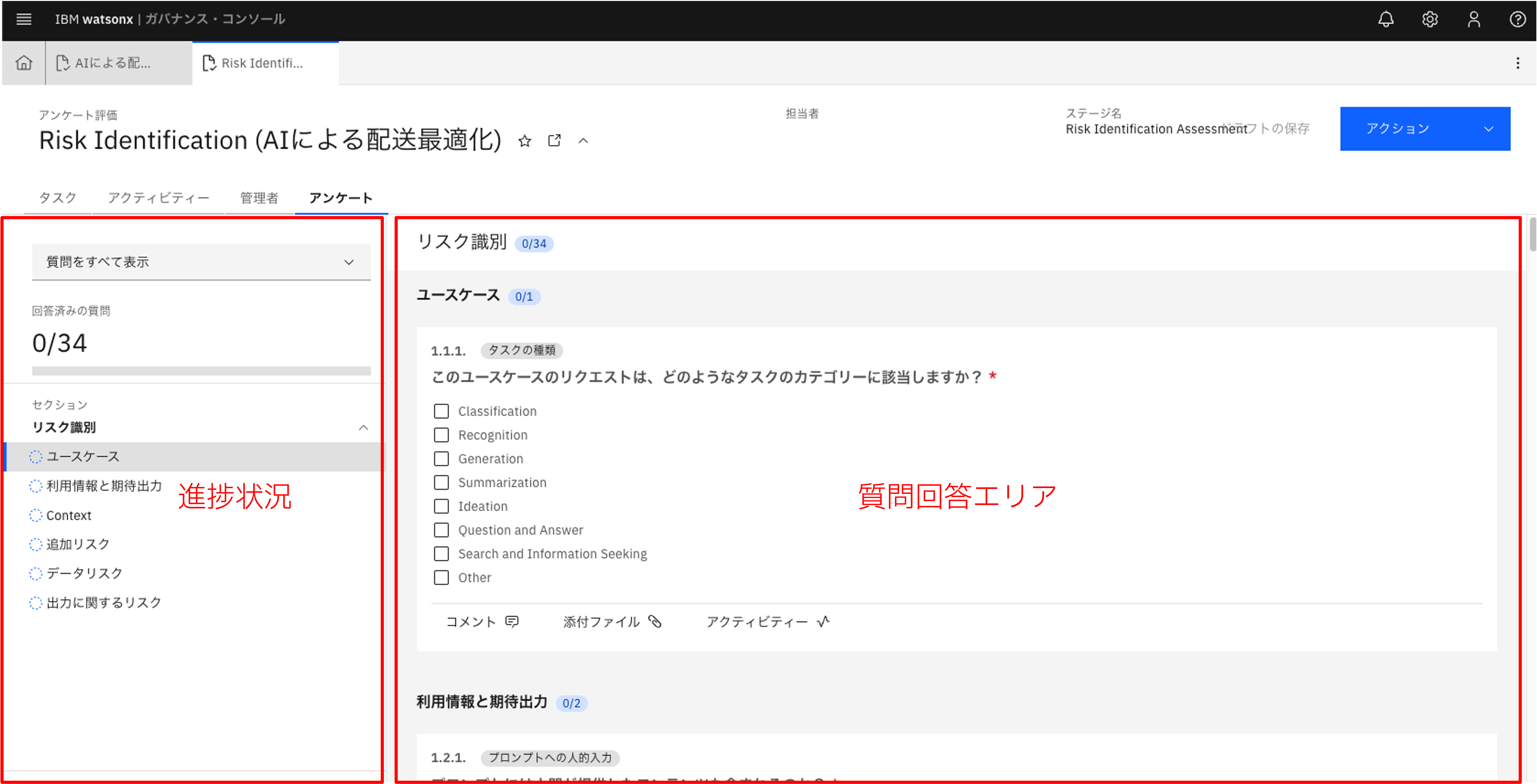- Risk Identification:該当ユースケースにおけるリスク識別のためのアンケートです。アンケートに回答することにより、ユースケースで評価すべきリスクを自動的に割り当てます。対象となるリスクはIBM Risk Atlasの定義を用います。