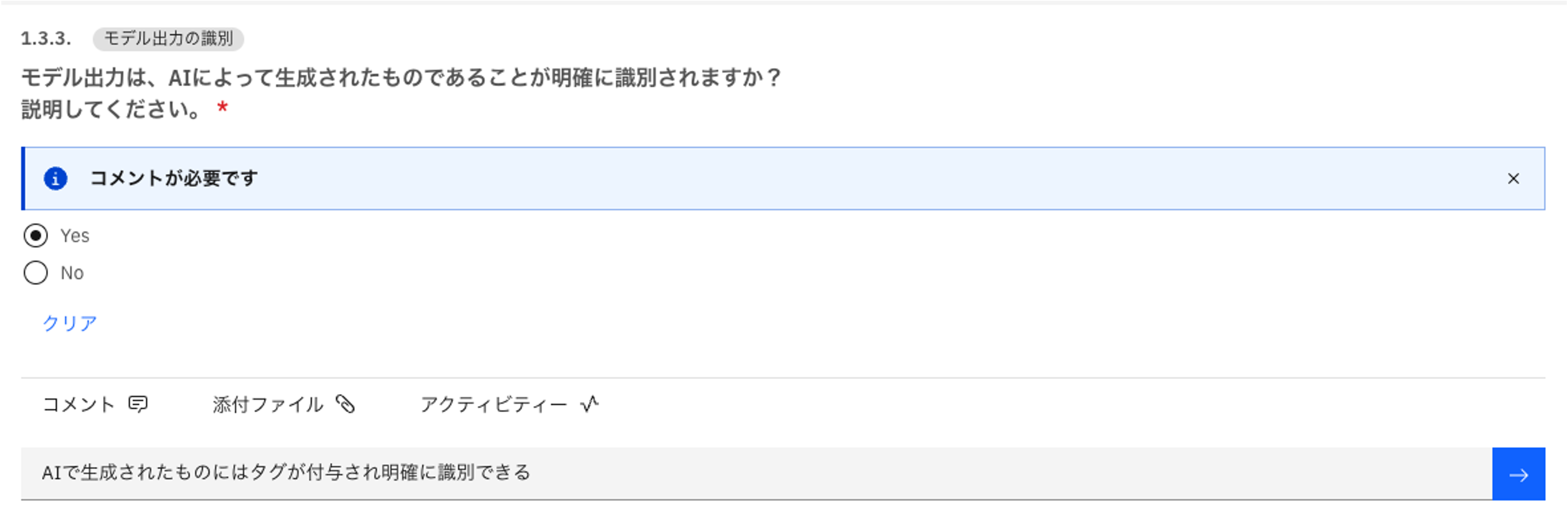 - ユースケース画面で、Applicability Assessment(ユースケース名) をクリックし、アンケート回答画面へ遷移します。Risk Identificationアンケート同様回答を記入します。