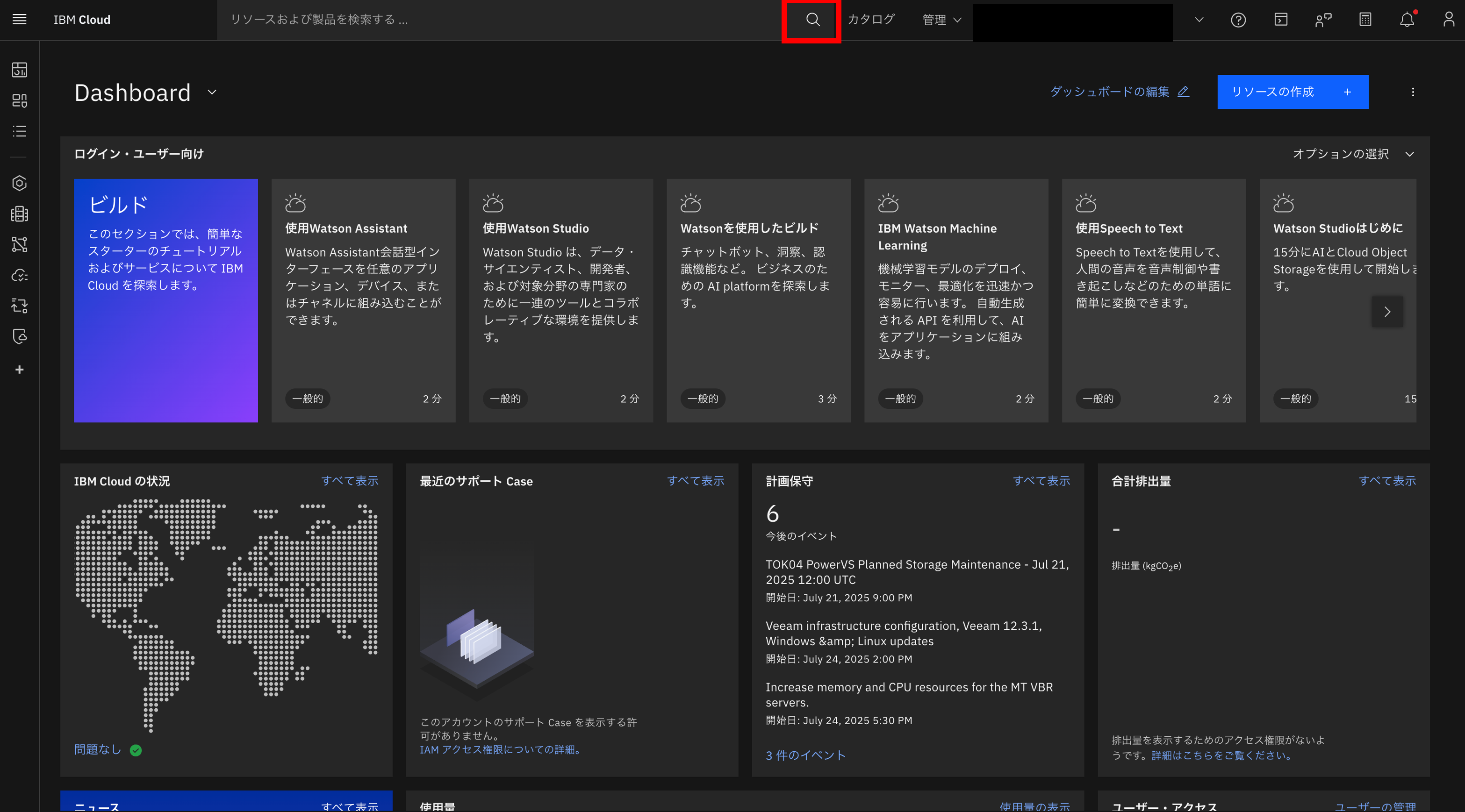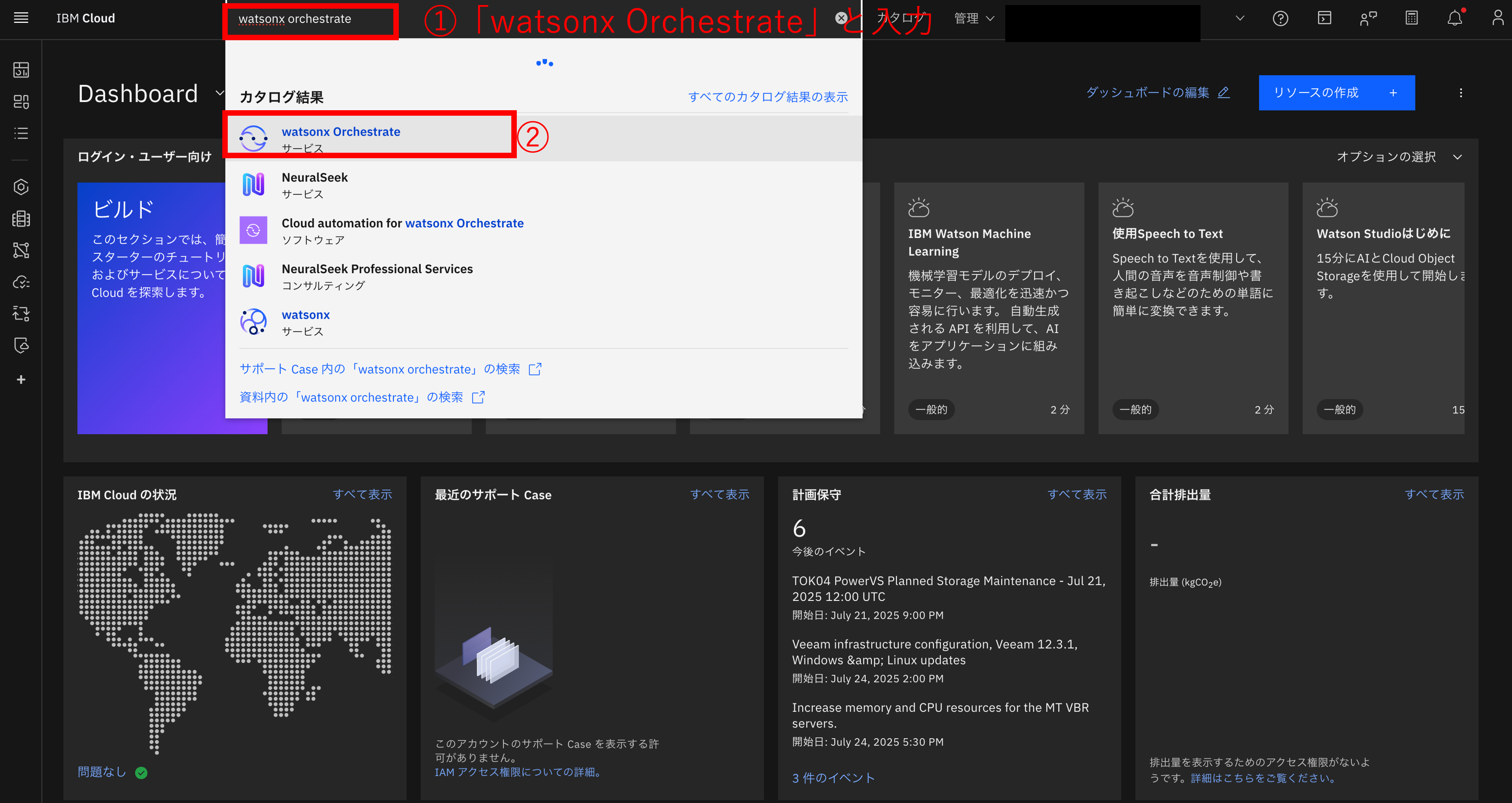 - 表示された入力欄に watsonx Orchestrate と入力し、数秒後に表示されるカタログ結果欄のwatsonx Orchestrateをクリックする
