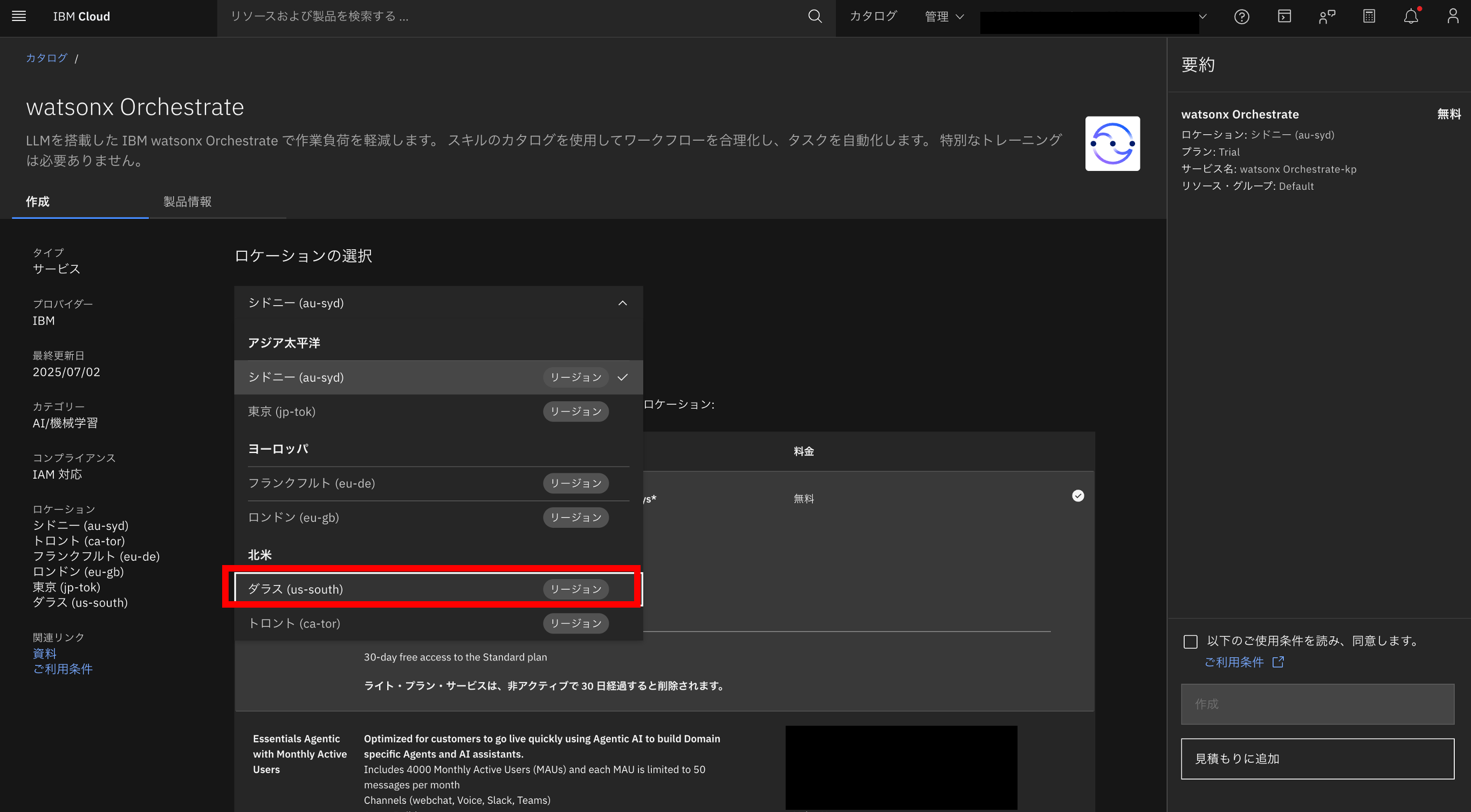 - ロケーションの選択 セクションで、使用するリージョンを選択する