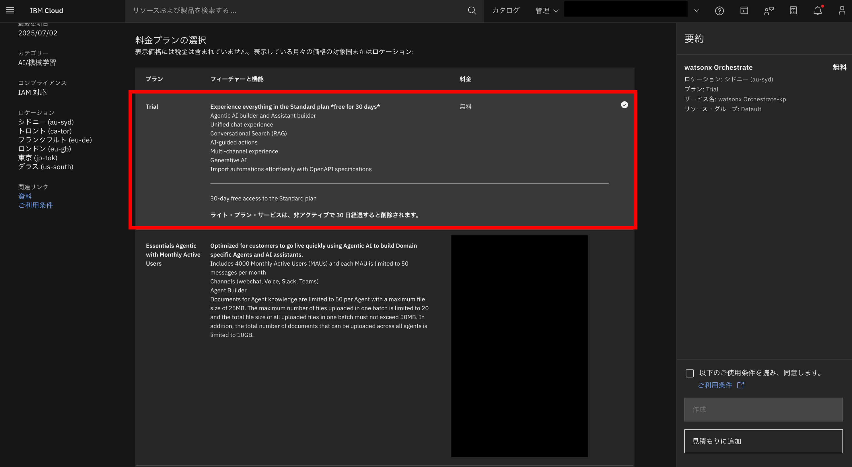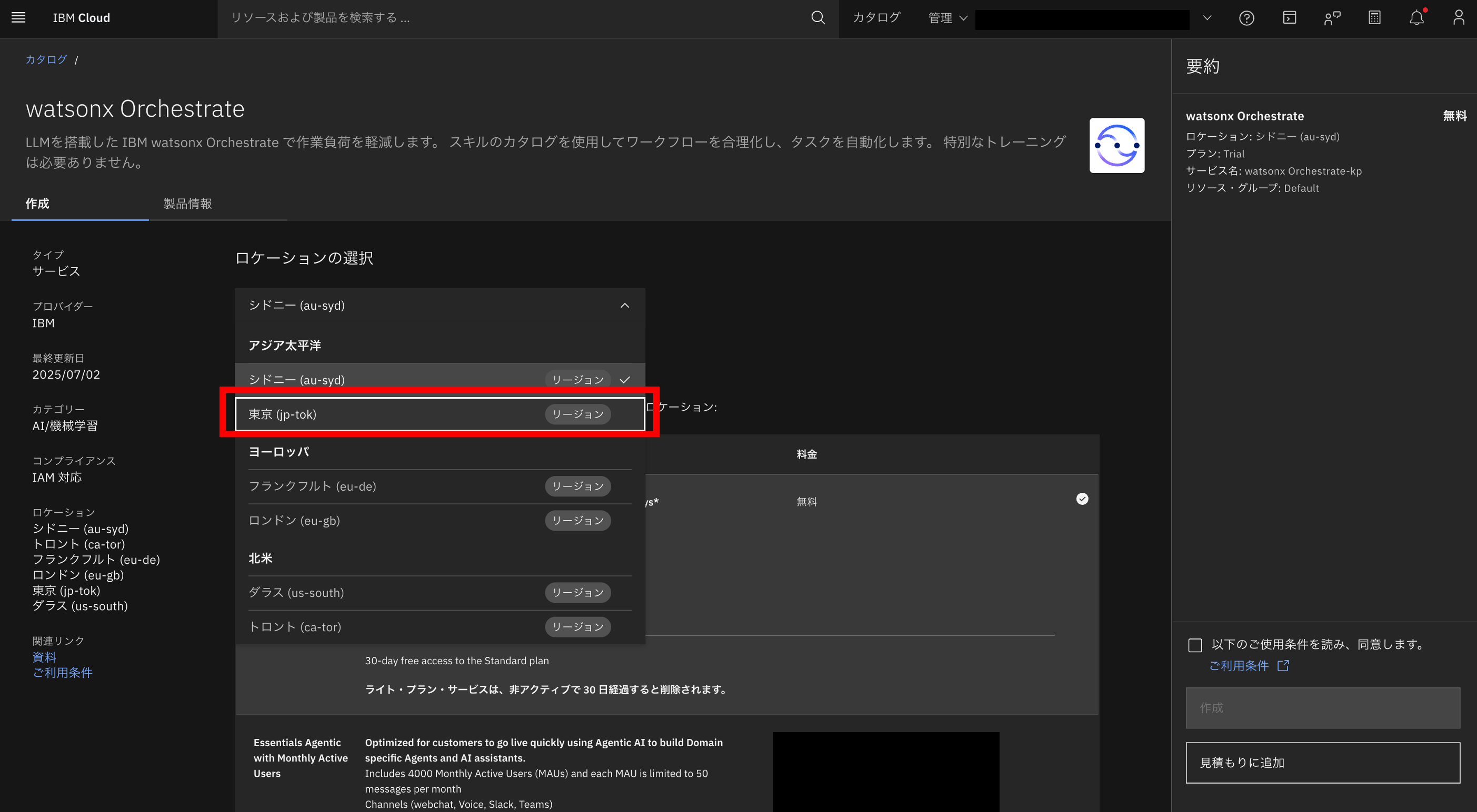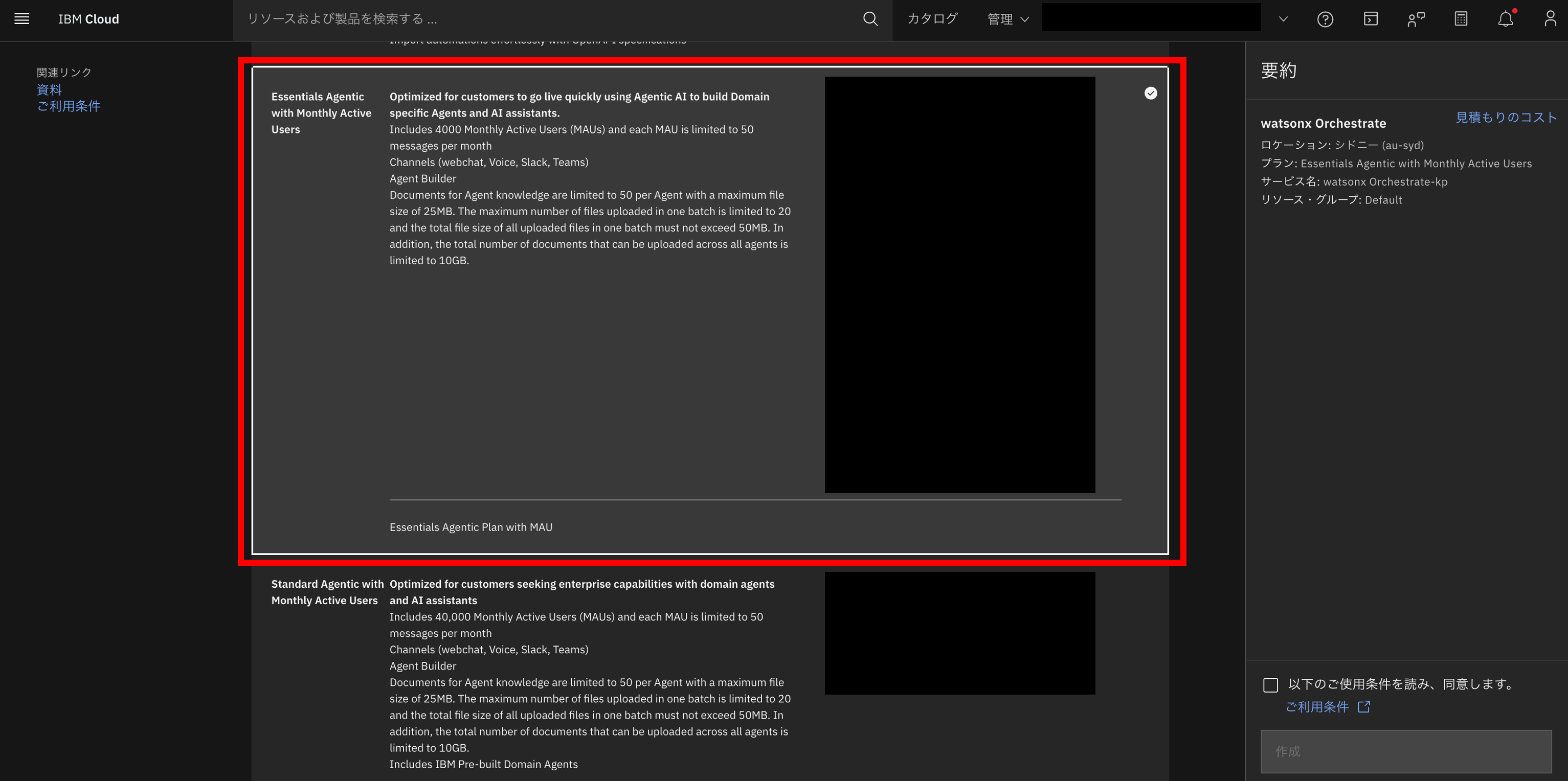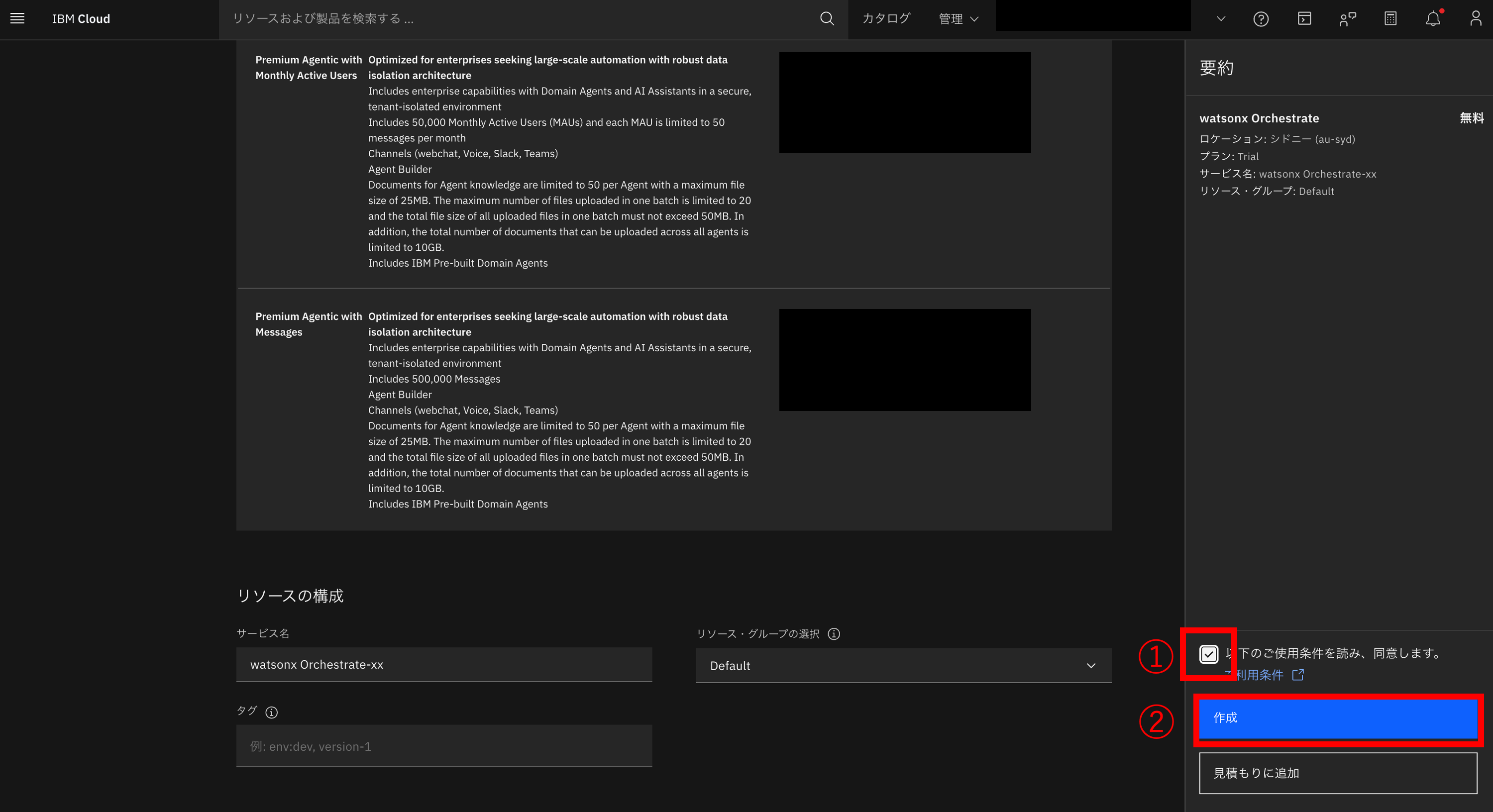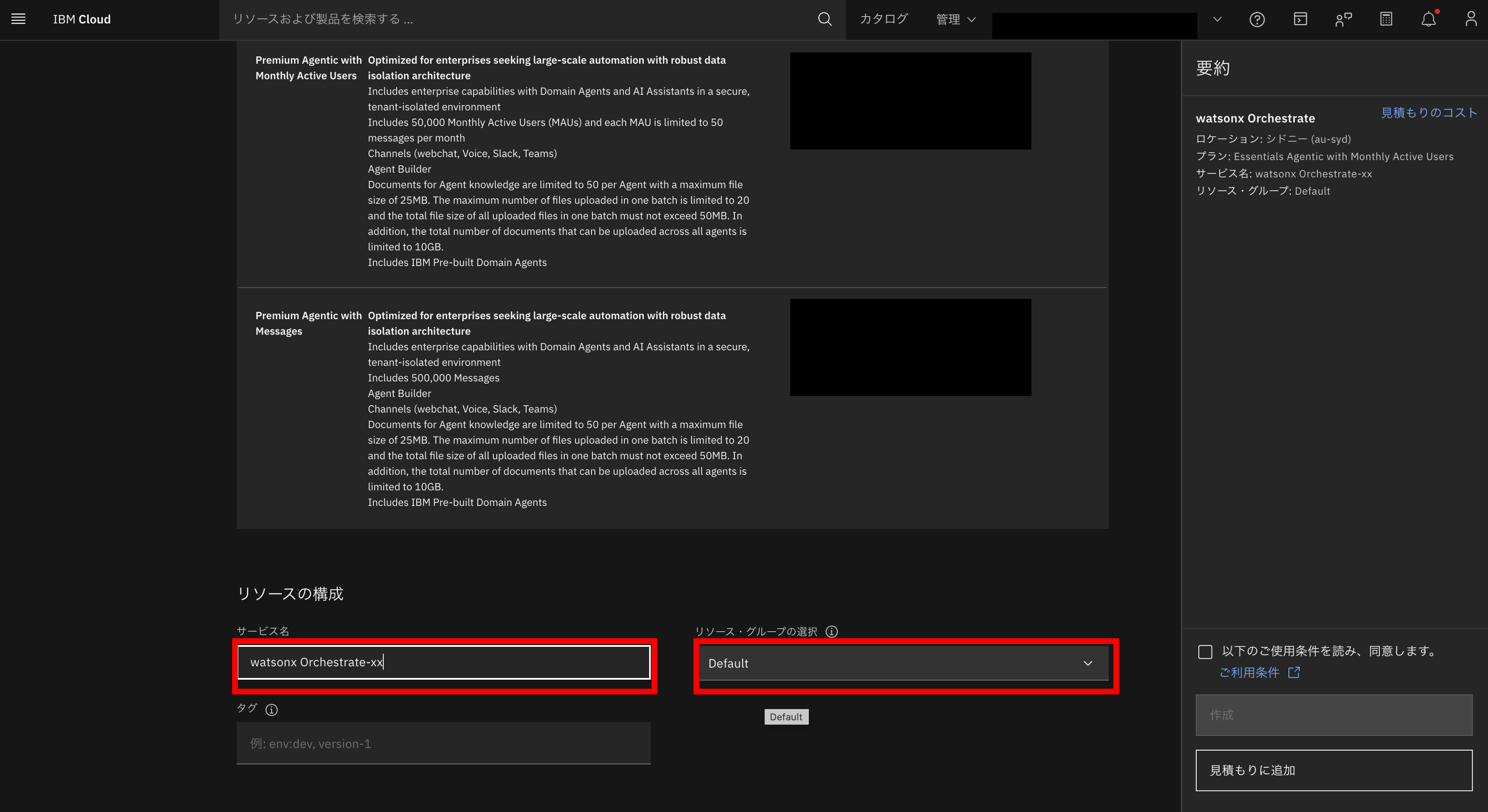 - リソースの構成 セクションで、サービス名に watsonx Orchestrate-xx を入力(xxは任意の文字列)、リソース・グループの選択でDefaultもしくは前で作成した RG_XXXXX を選択する。タグは空欄でOK