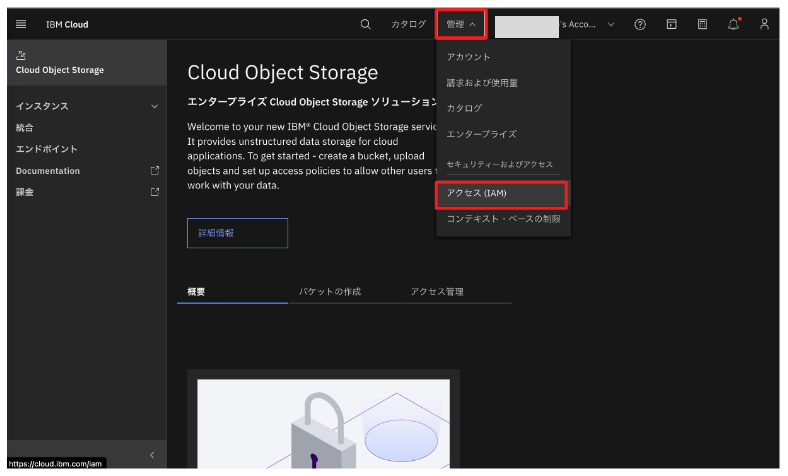 - 画面右上「管理」→「アクセス(IAM)」をクリックします。