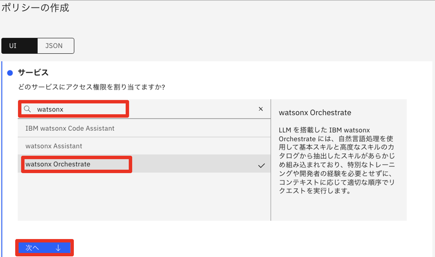 - サービスセクションで「watsonx Orchestrate」を入力し、一覧に表示された「watsonx Orchestrate」を選択します。「次へ」ボタンをクリックします。