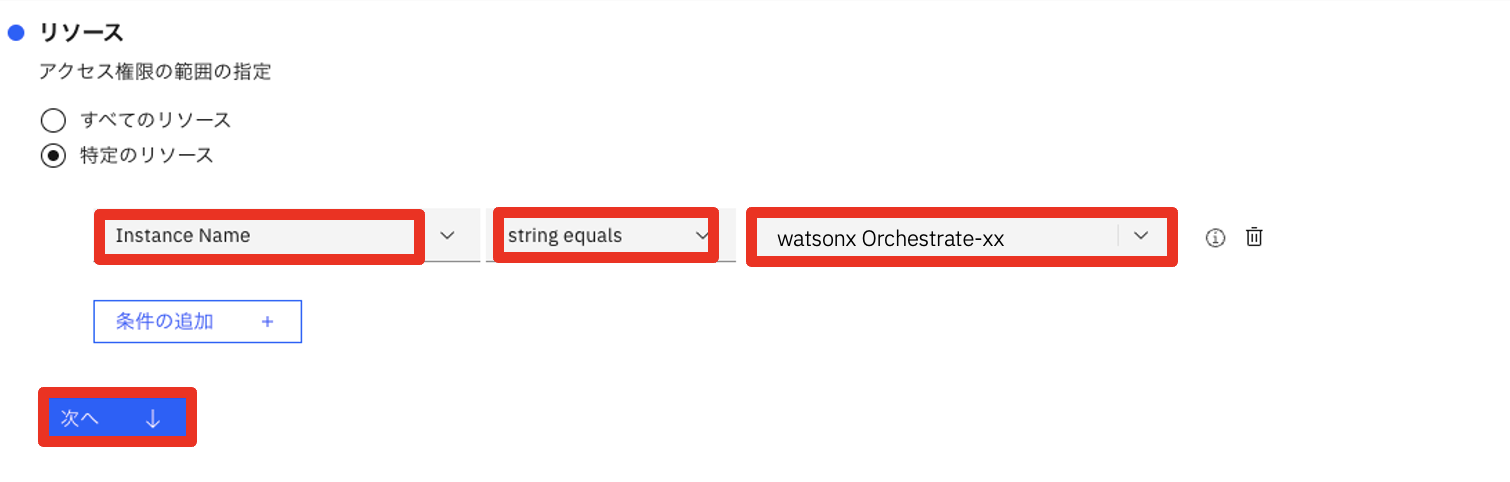 - 「リソース」セクションでは、「アクセス権限の範囲の指定」で「特定のリソース」を選択します。 次に、以下のように設定を行います: