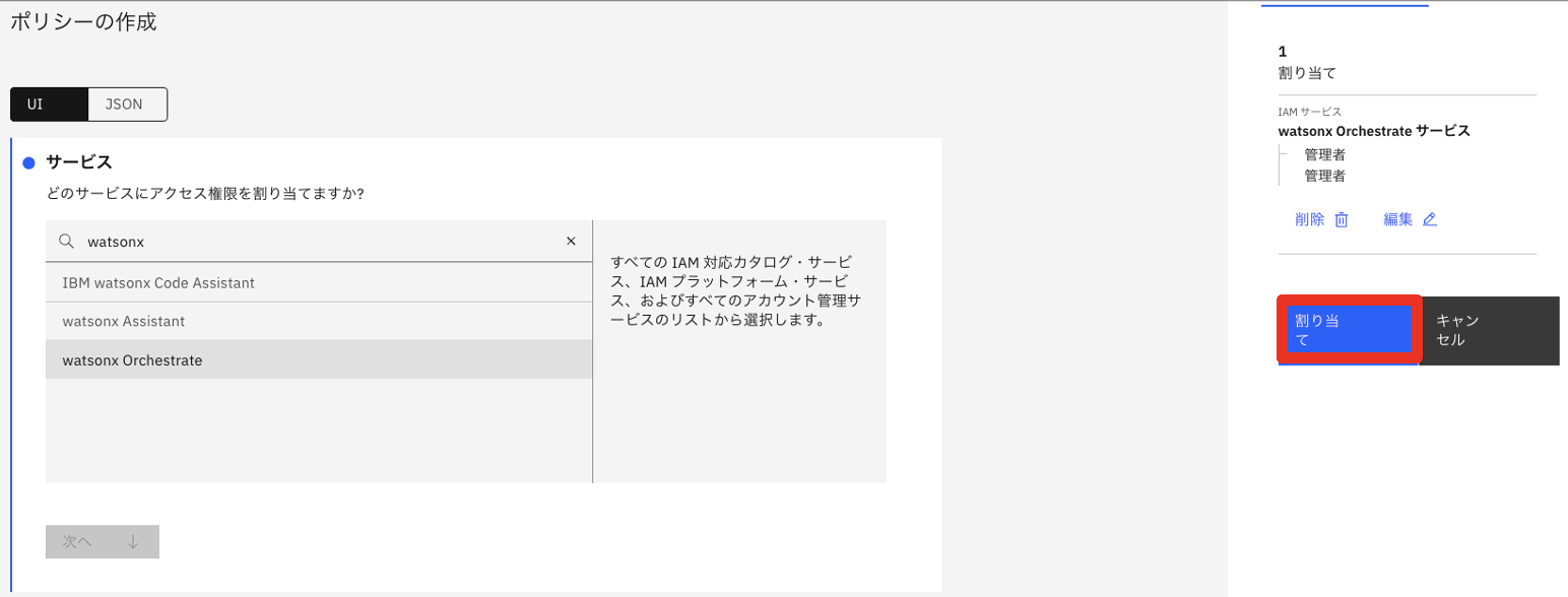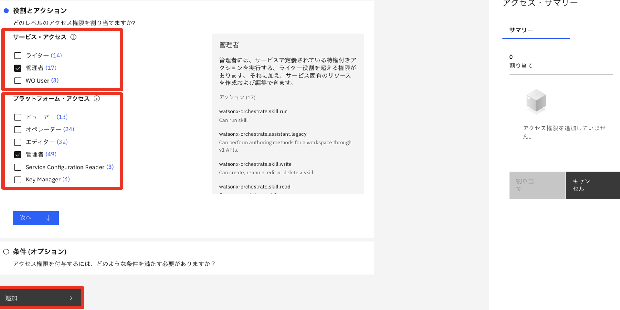 - 「サービス・アクセス」では、watsonx Orchestrate の利用者権限を「管理者」に設定します。