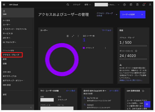 - 「プラットフォーム・アクセス」では、IBM Cloud の利用者権限を「管理者」に設定します。