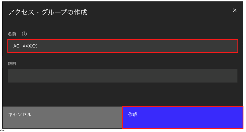 - 名前に「AG_XXXXX」と入力し、「作成」ボタンをクリックします。