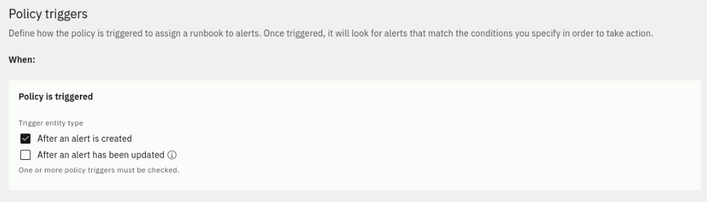 In a real production scenario, you would likely want to check this box so that the runbook runs automatically when the alert arrives. For example, the runbook could be used to automatically open a ticket in a ticketing system, or automatically run a script to remediate the issue.