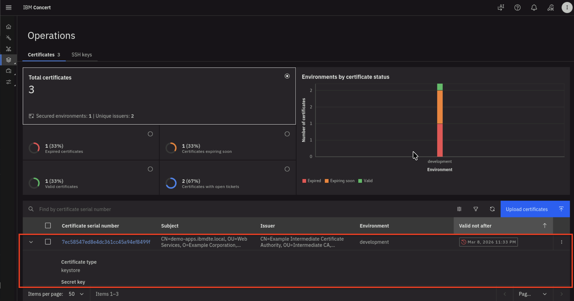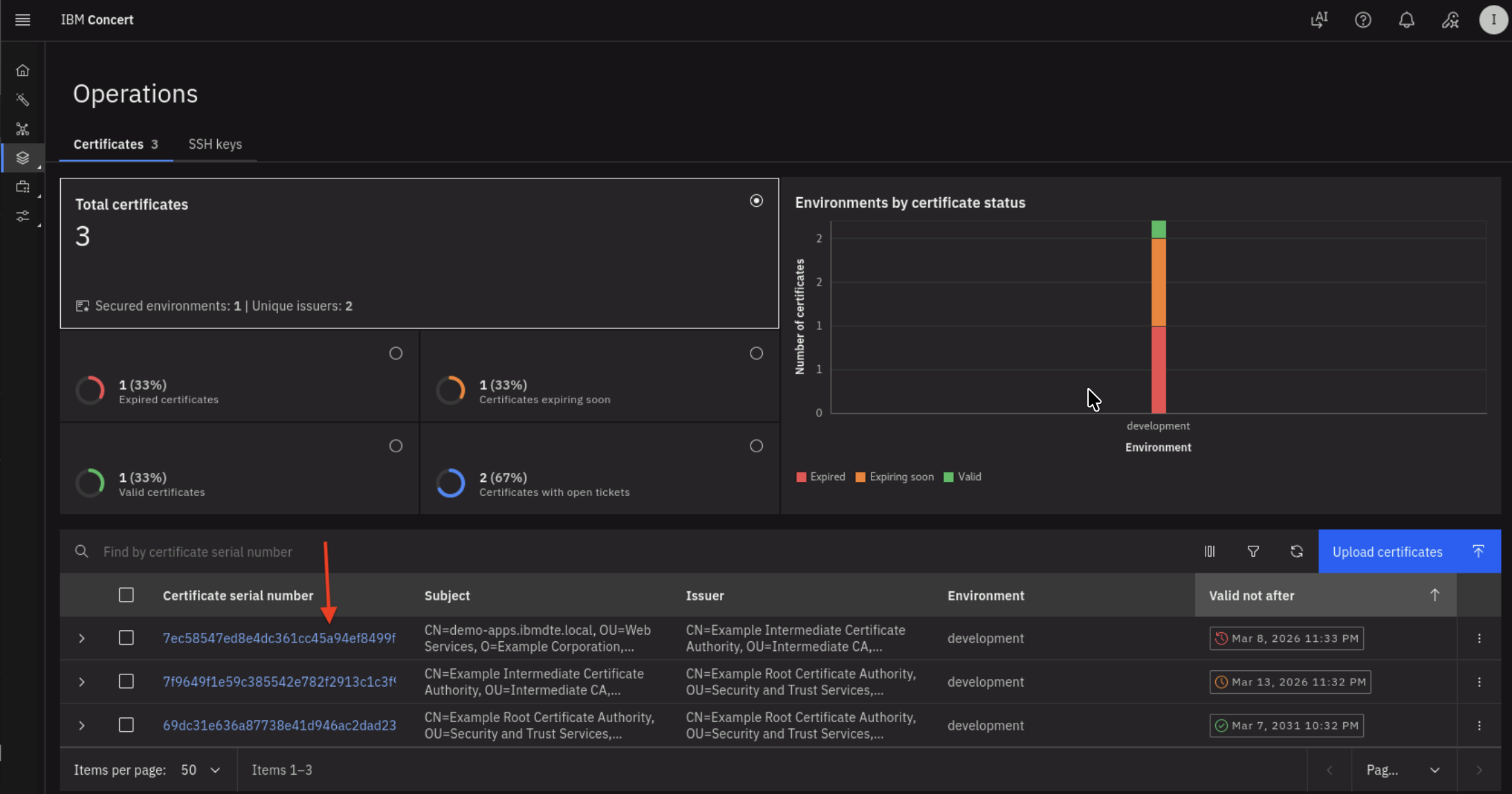 - Repeat the same curl command using another certificate serial number from the Concert Certificate UI and observe the output.