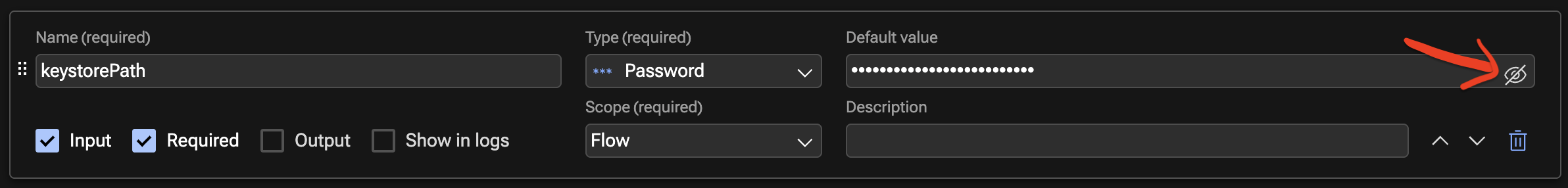 - Under keystorePath name, click Eye icon as shown below to reveal the text, for Default value, type