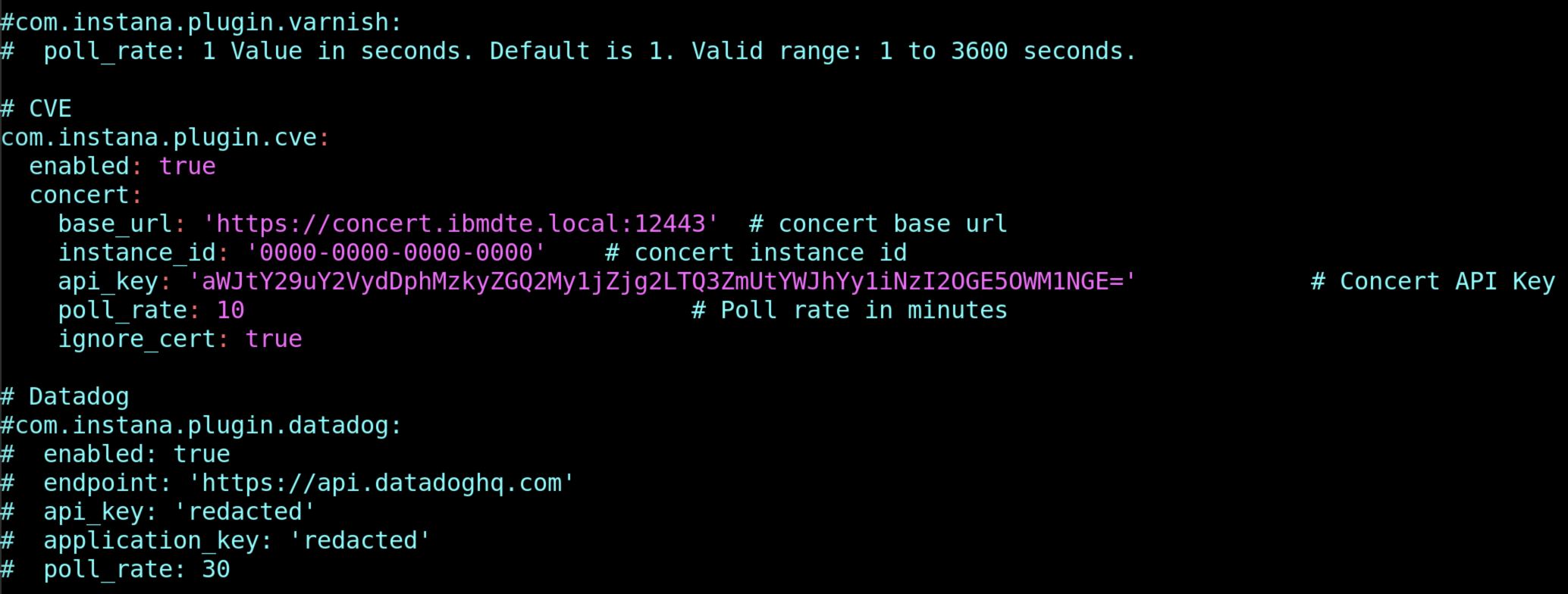 Uncomment the com.instana.plugin.cve: section and update it to include the Concert connection details as shown below.