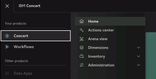 - To access the Concert UI, click on the burger menu on the top left corner and select Concert -> Home.