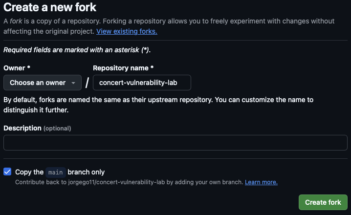 - In the Create a new fork page, keep the default settings and click Create fork as shown below (your GitHub username will be shown under Owner).: