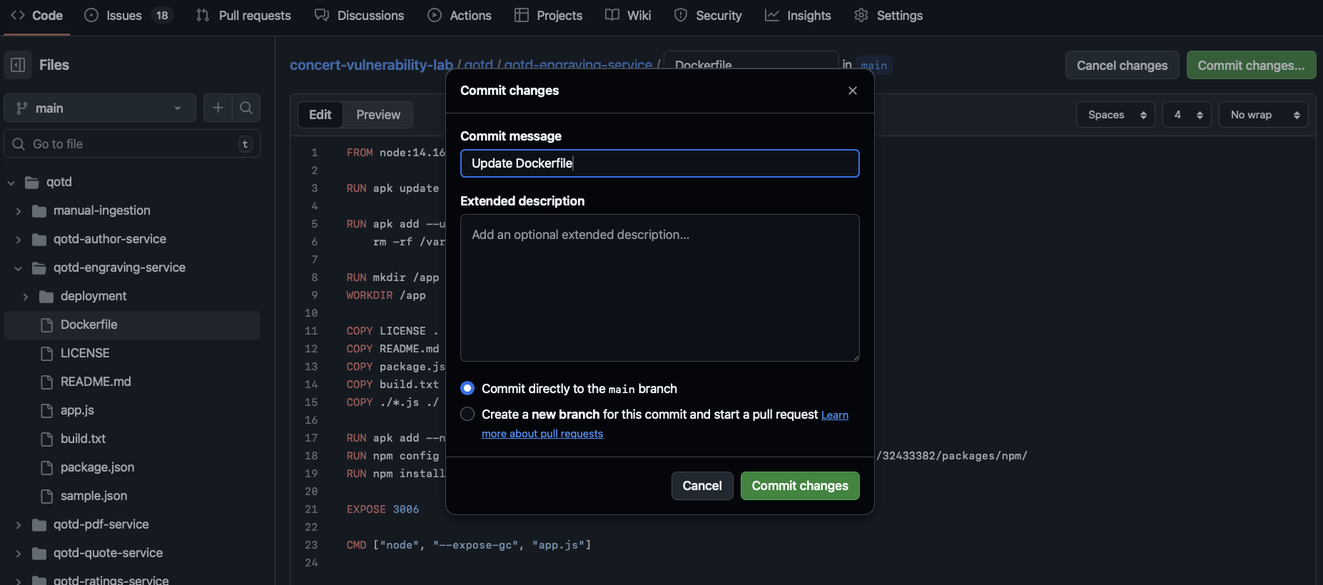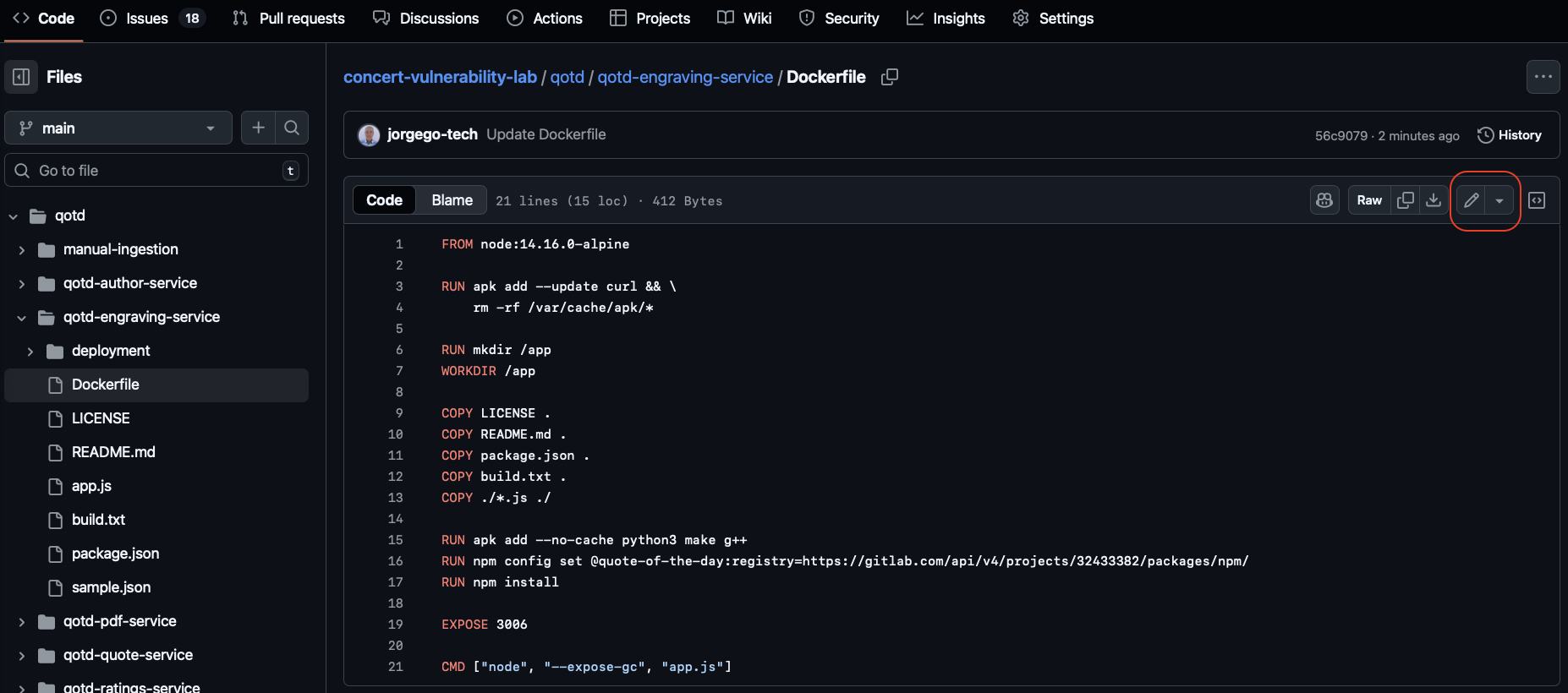 Open the Dockerfile in the qotd-engraving-service directory and click on the edit icon (pencil icon) to edit the file as shown below:
