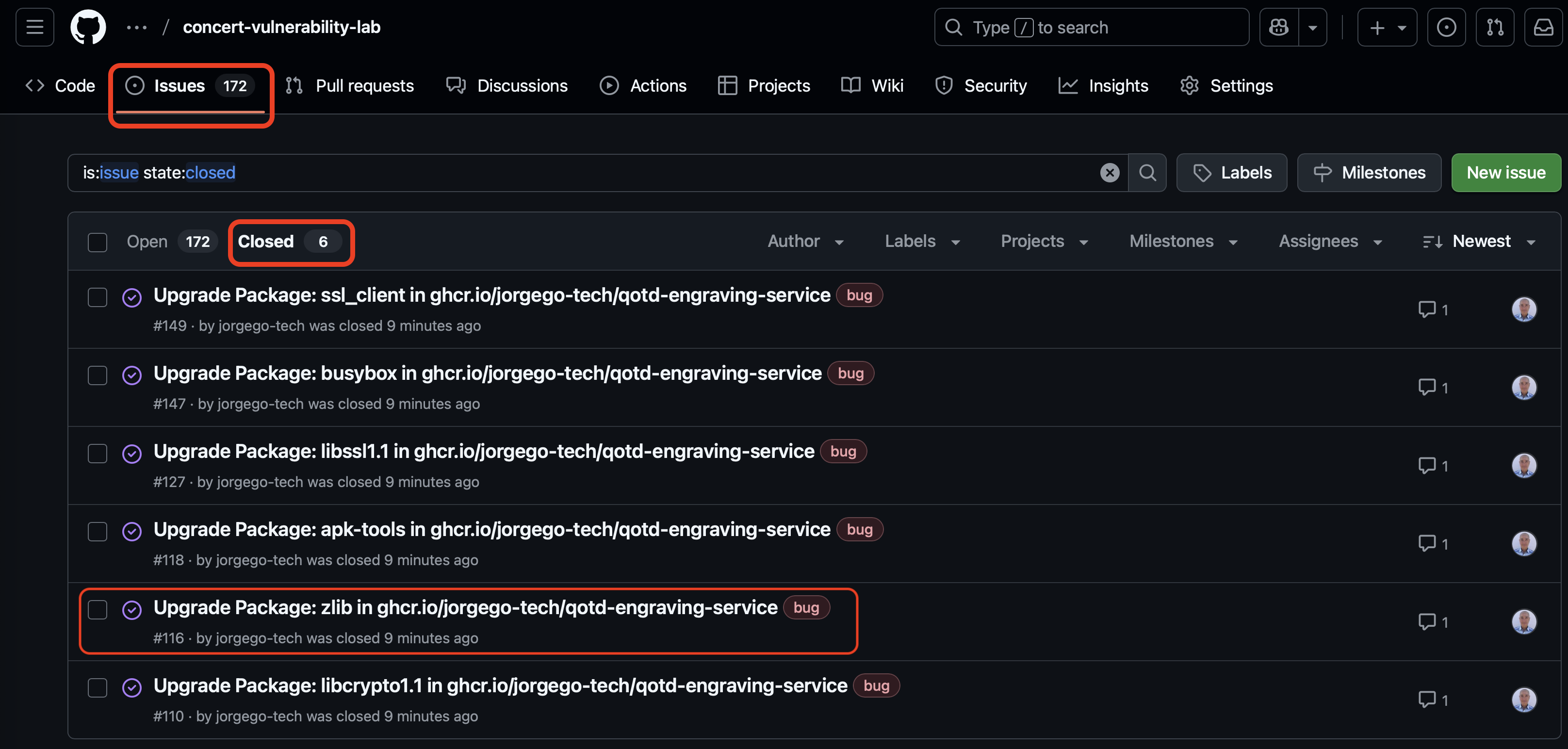 Finally, we will verify that the vulnerability has been resolved in Concert and that the related issue in GitHub has been closed.