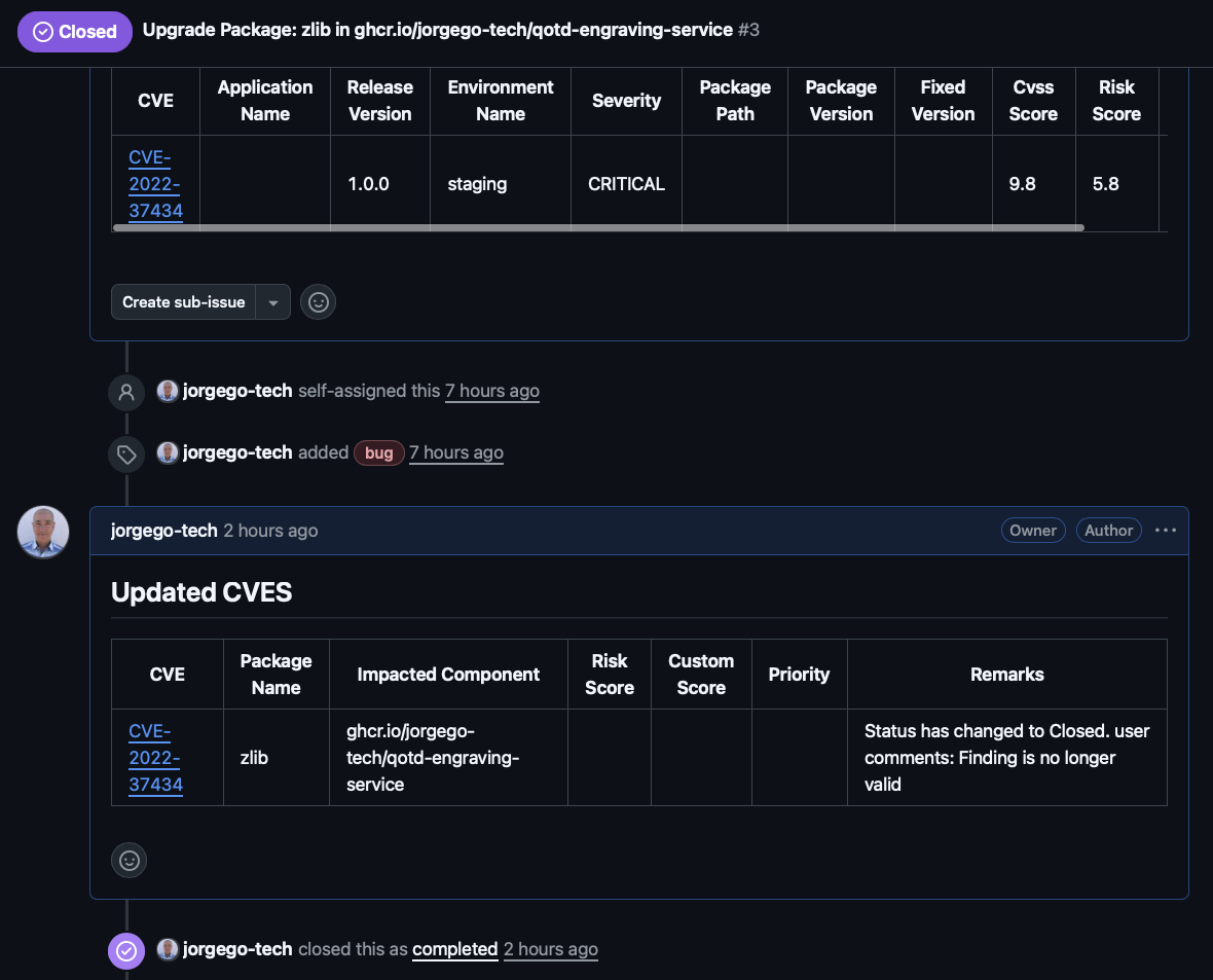 Open the closed issue to view the details. You can see that the issue was automatically closed by Concert due to the fact that the vulnerability CVE-2022-37434 does not affect the finding on qotd-engraving-service anymore.