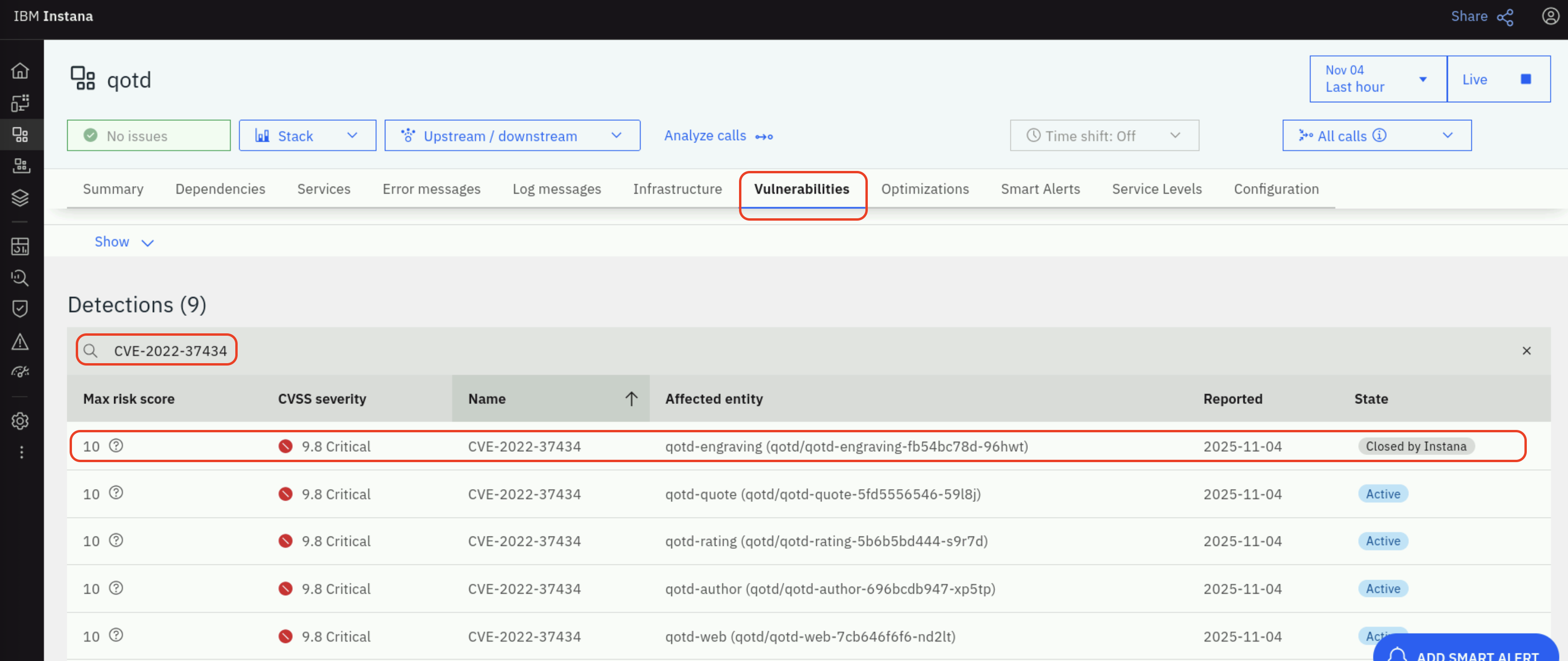 Note that the State of the CVE-2022-37434 for the Affected entity qotd-engraving is Closed by Instana.
