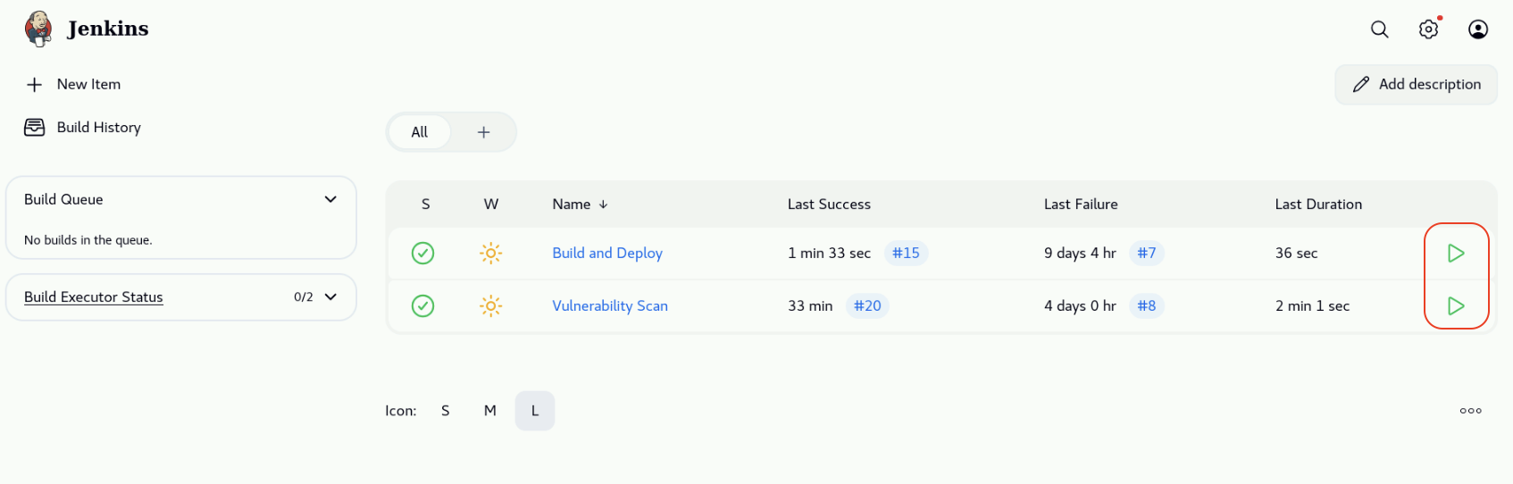 On the Jenkins dashboard, click on the play button on the right corresponding to the Build and Deploy pipeline and follow the execution progress (remember that this pipeline takes about 10 minutes to complete).