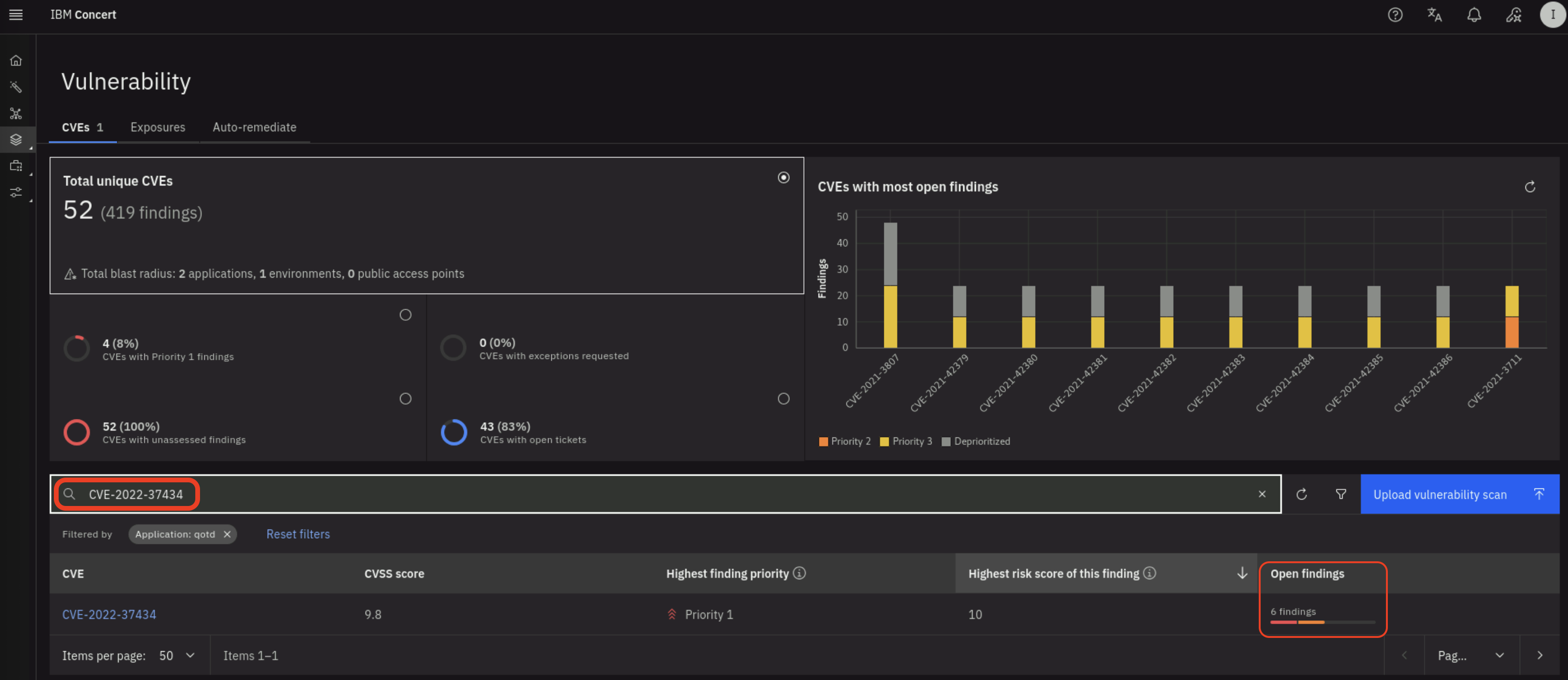 After both pipelines completed successfully, Concert received the updated vulnerability scan results and automatically updated the finding related to the qotd-engraving-service container image.