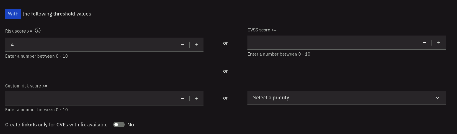 - For Create tickets only for CVEs with fix available, keep No as selection.