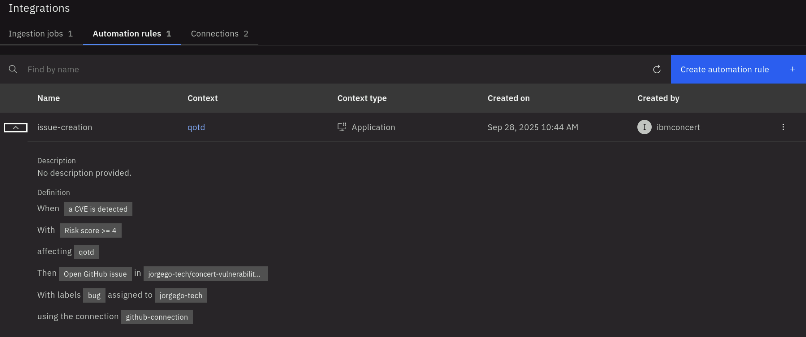 In this section, we will configure automation rules to allow Concert to create issues/tickets automatically, then we will perform the vulnerability scanning of the qotd application container images using Trivy, and integrate it into the Jenkins CI/CD pipeline. We will also verify that the vulnerability information is ingested into Concert and is visible in the Concert dashboard. At the same time, Instana will pull the vulnerability information from Concert.