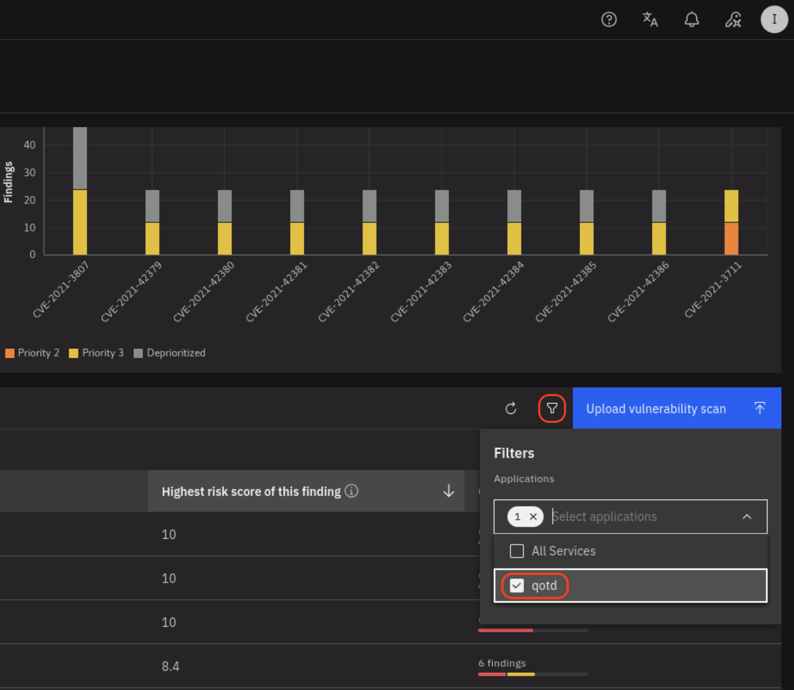 On the Vulnerability dashboard in Concert (Dimensions -> Vulnerability), click on the filter icon on the right and select the qotd application as shown below: