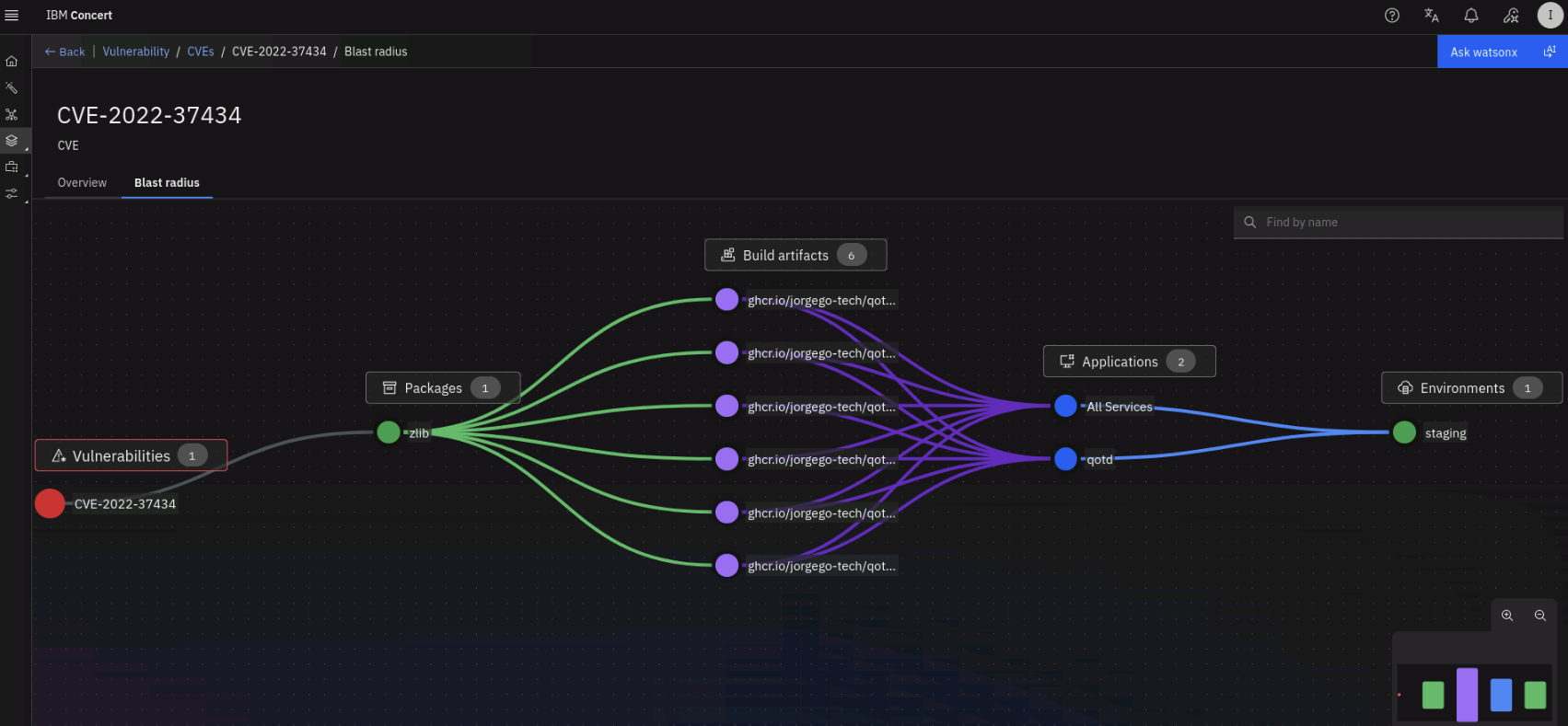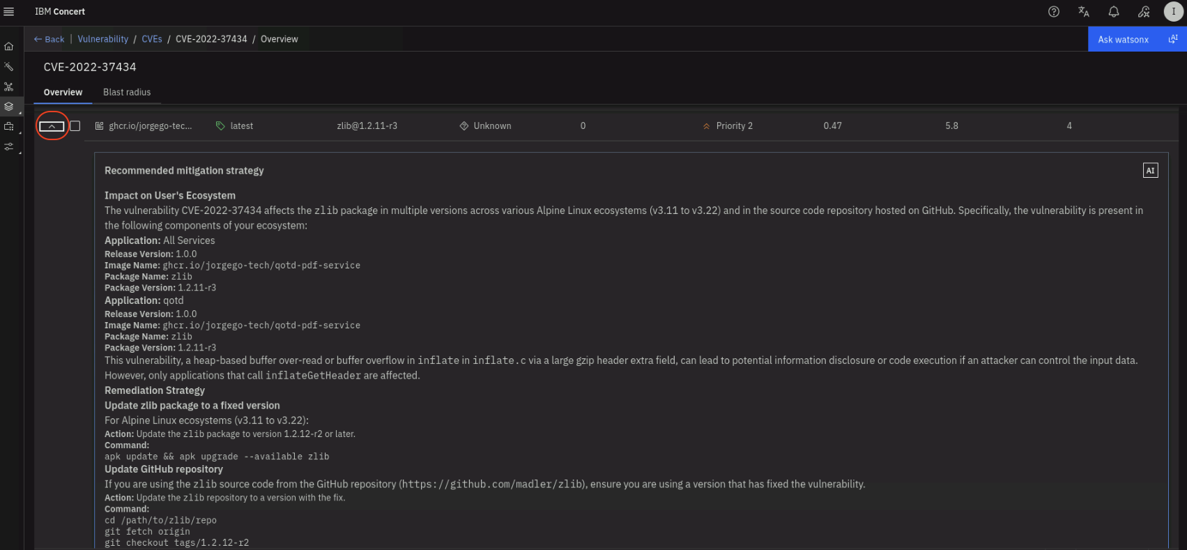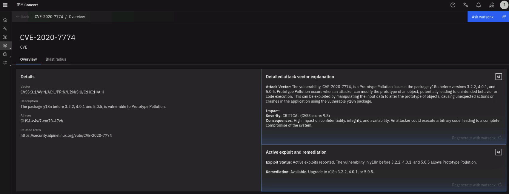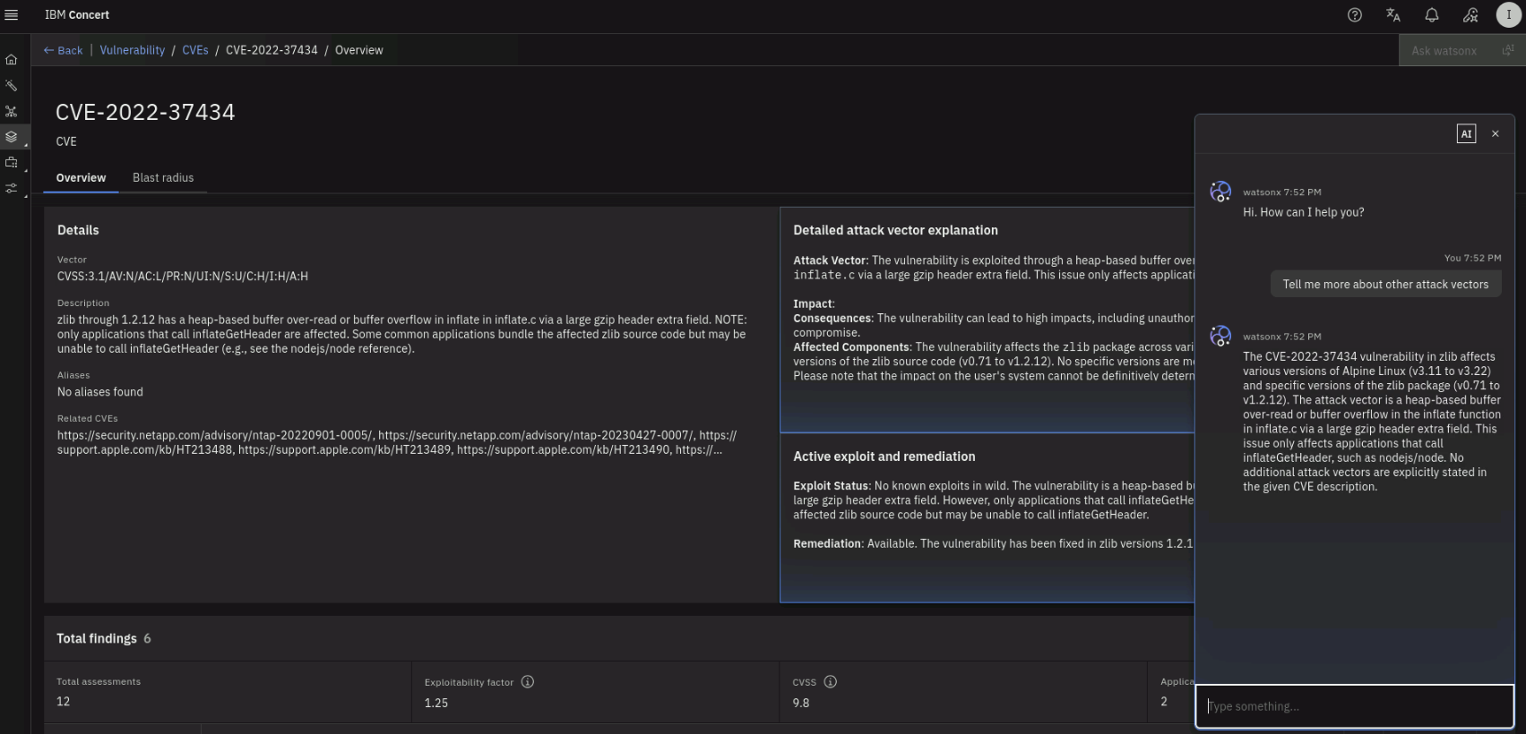 The CVE Details section shows the description of the vulnerability, the Detailed attack vector explanation and the Active exploit and remediation are populated by watsonx. On the top right, using the Ask watsonx button, you can ask questions about the vulnerability and get answers powered by watsonx.