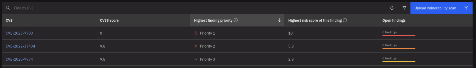 Note the total number of unique CVEs found across all images and the number of findings. Click on the Highest finding priority to sort downward to see the highest priority vulnerabilities first. Select a CVE with Priority 1 or 2 and click on it to see more details.