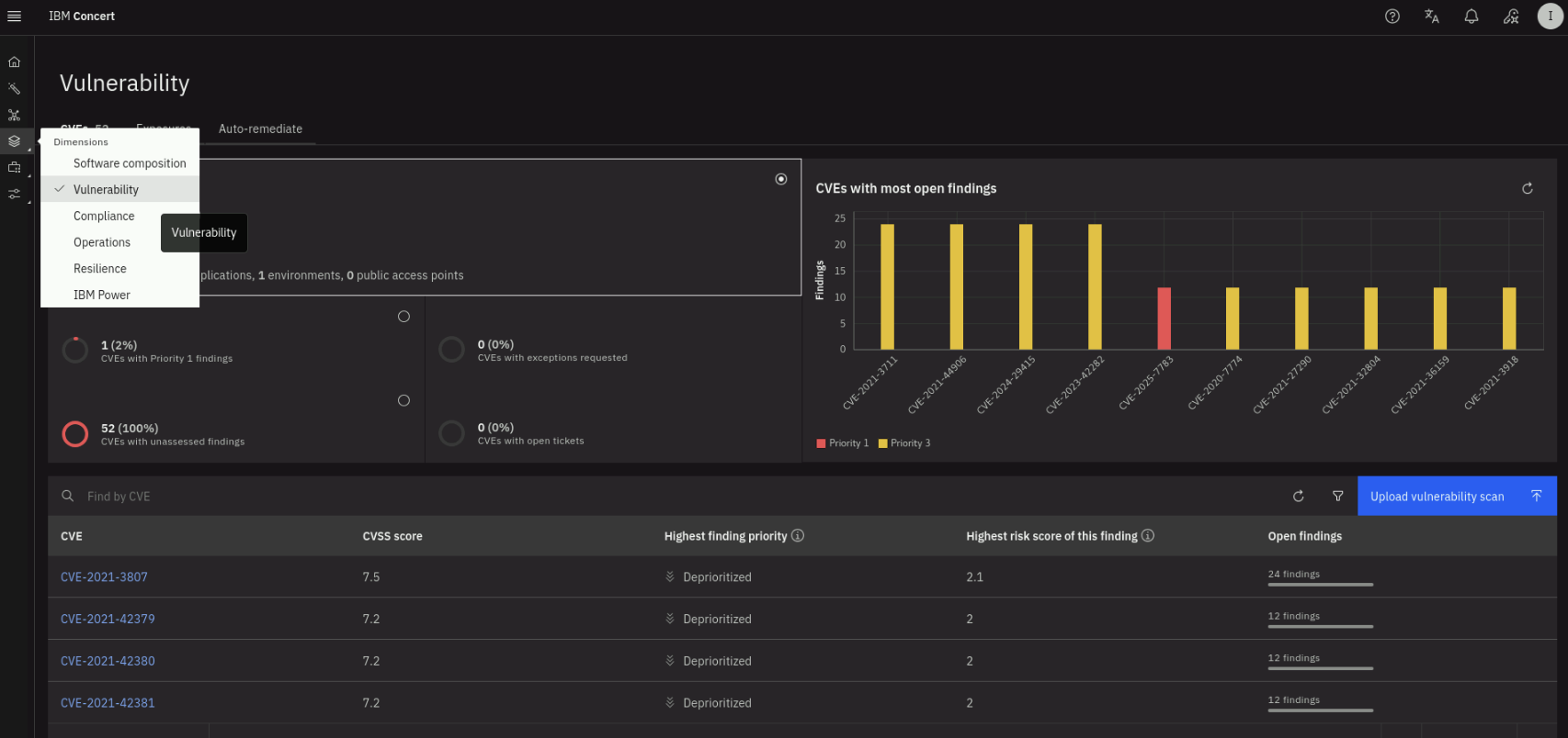 On the Concert dashboard, click on Dimensions -> Vulnerability on the left menu as shown below.