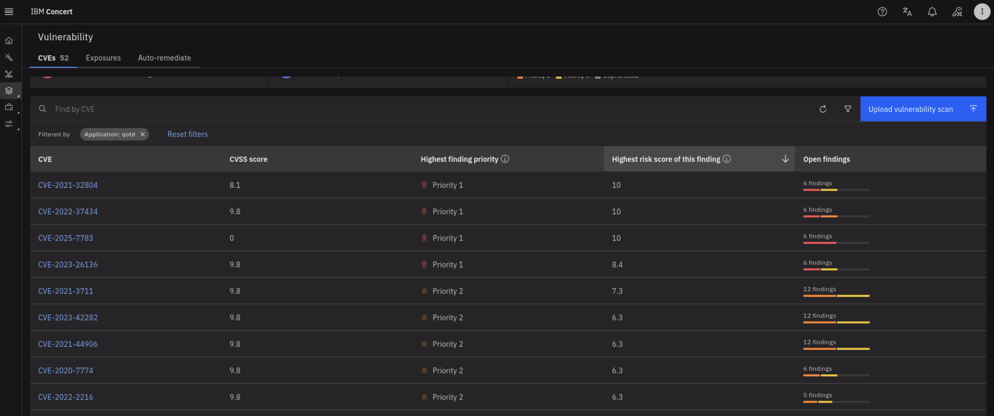 Once the Vulnerability Scan pipeline completes successfully, we will verify that the vulnerability information has been ingested into Concert and is visible in the Concert Vulnerability dashboard.