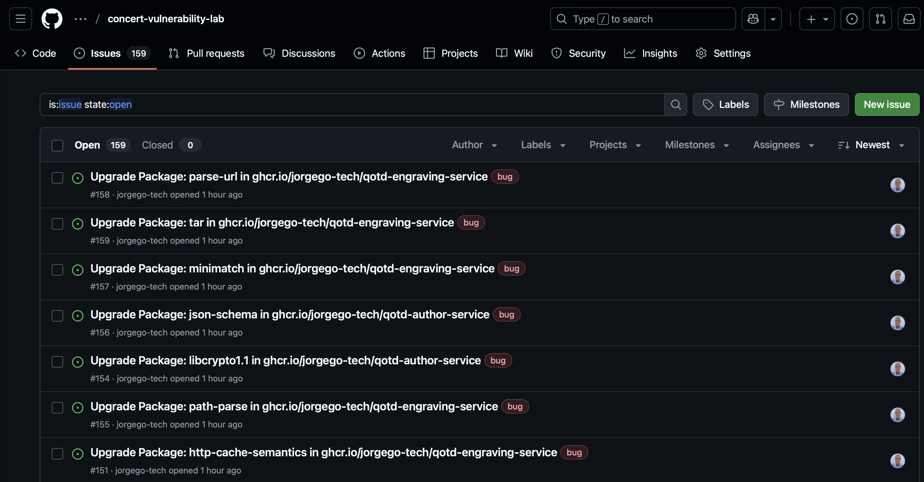 Now, on a new browser tab, login into your GitHub account and open the concert-vulnerability-lab repository. Select the Issues tab. Note that there are various issues created by Concert, one for each CVE finding.