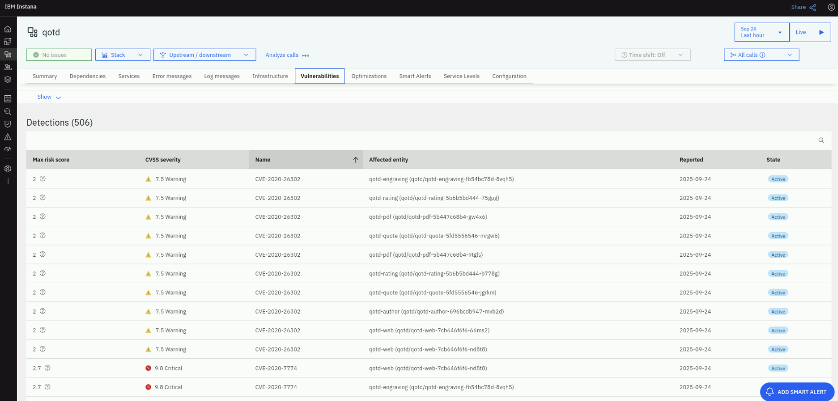 On the Instana dashboard, click on Applications on the left menu. On the Applications page, click on the qotd application. On the qotd application page, click on the Vulnerabilities tab. Note that the vulnerabilities found by the Trivy scanner are listed here as well because the Instana CVE Sensor that we have configured, pulls the vulnerability information from Concert.