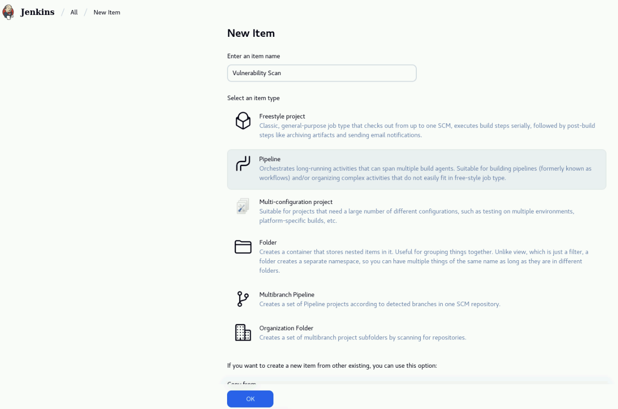On the New Item page, on the Enter an item name field, enter Vulnerability Scan. Select Pipeline and click OK.