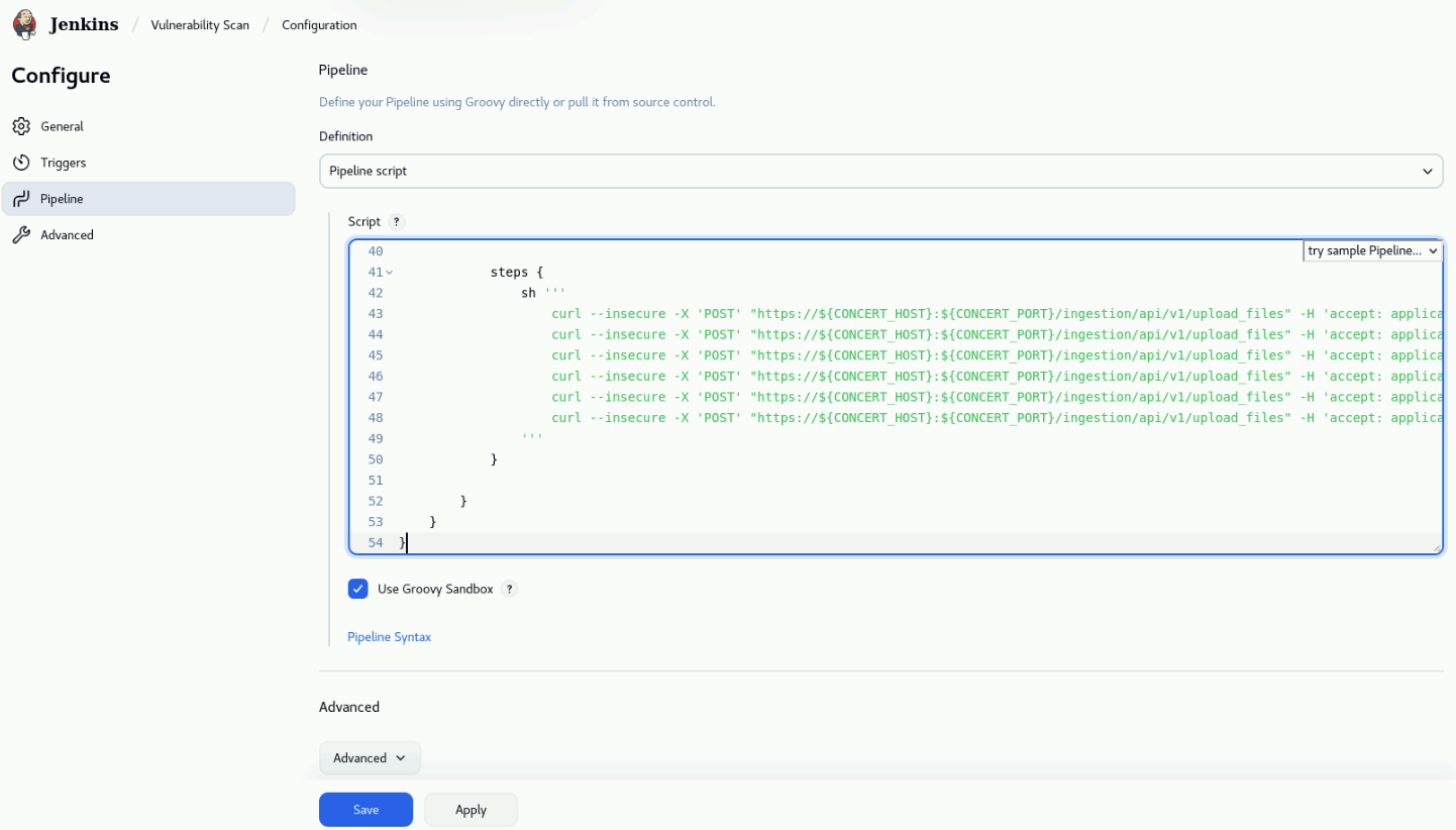 In the Configure page, select Pipeline on the left menu. Under the Pipeline section, leave Pipeline script in the Definition field and copy the following code (hover on the code and use the top-right Copy button to avoid missing code). Paste the code into the Script field. Click on Save to save the pipeline.