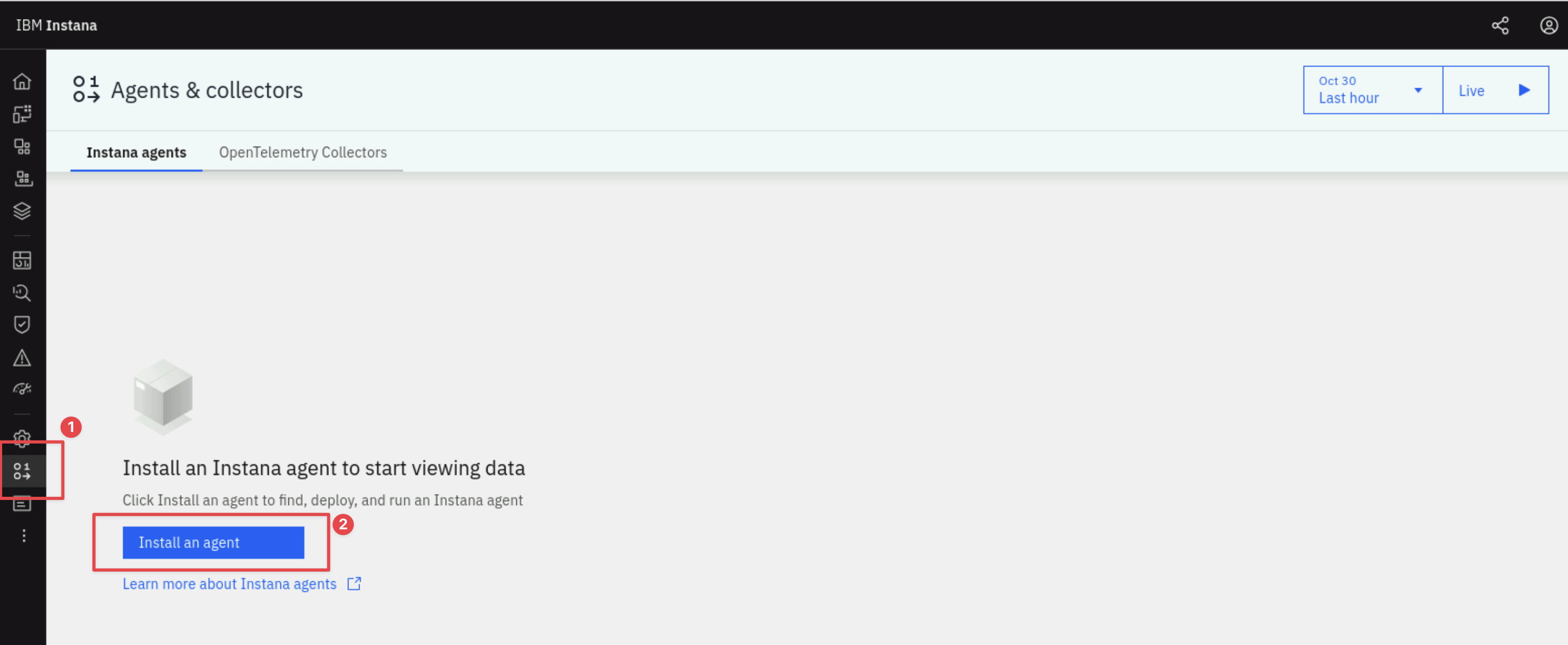Alternatively you can again select Agents & collectors from the left navigation menu and then clicking the Install an agent button.
